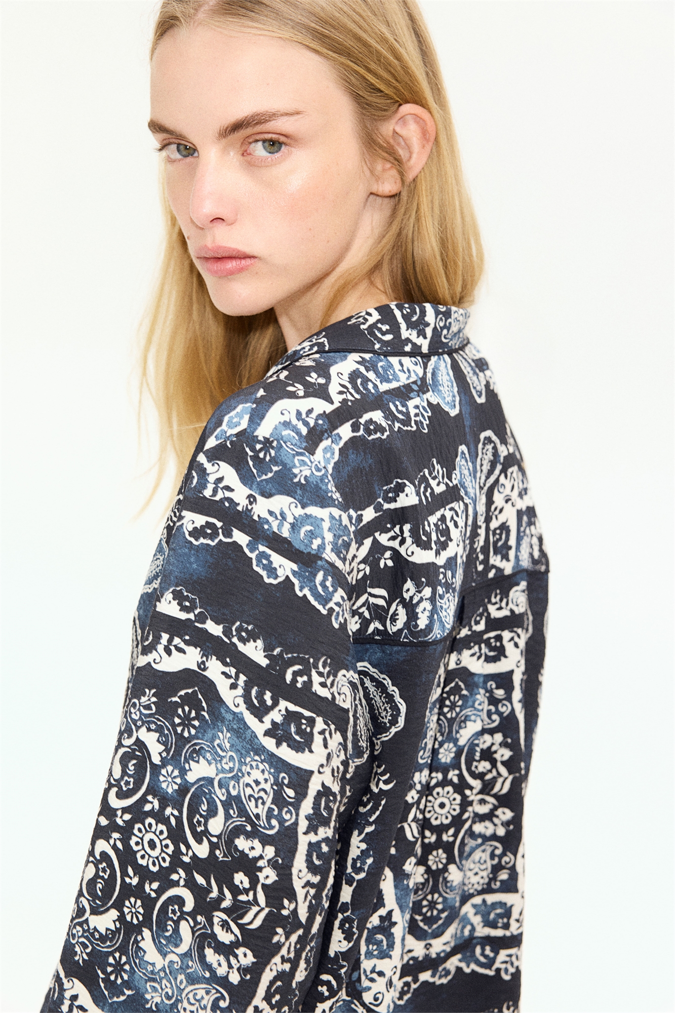 Свободная рубашка свободного покроя с узорчатым переплетением, закругленным курортным воротником и пуговицами спереди. Длинные рукава с разрезом и манжетами на пуговицах. Подол прямого кроя.