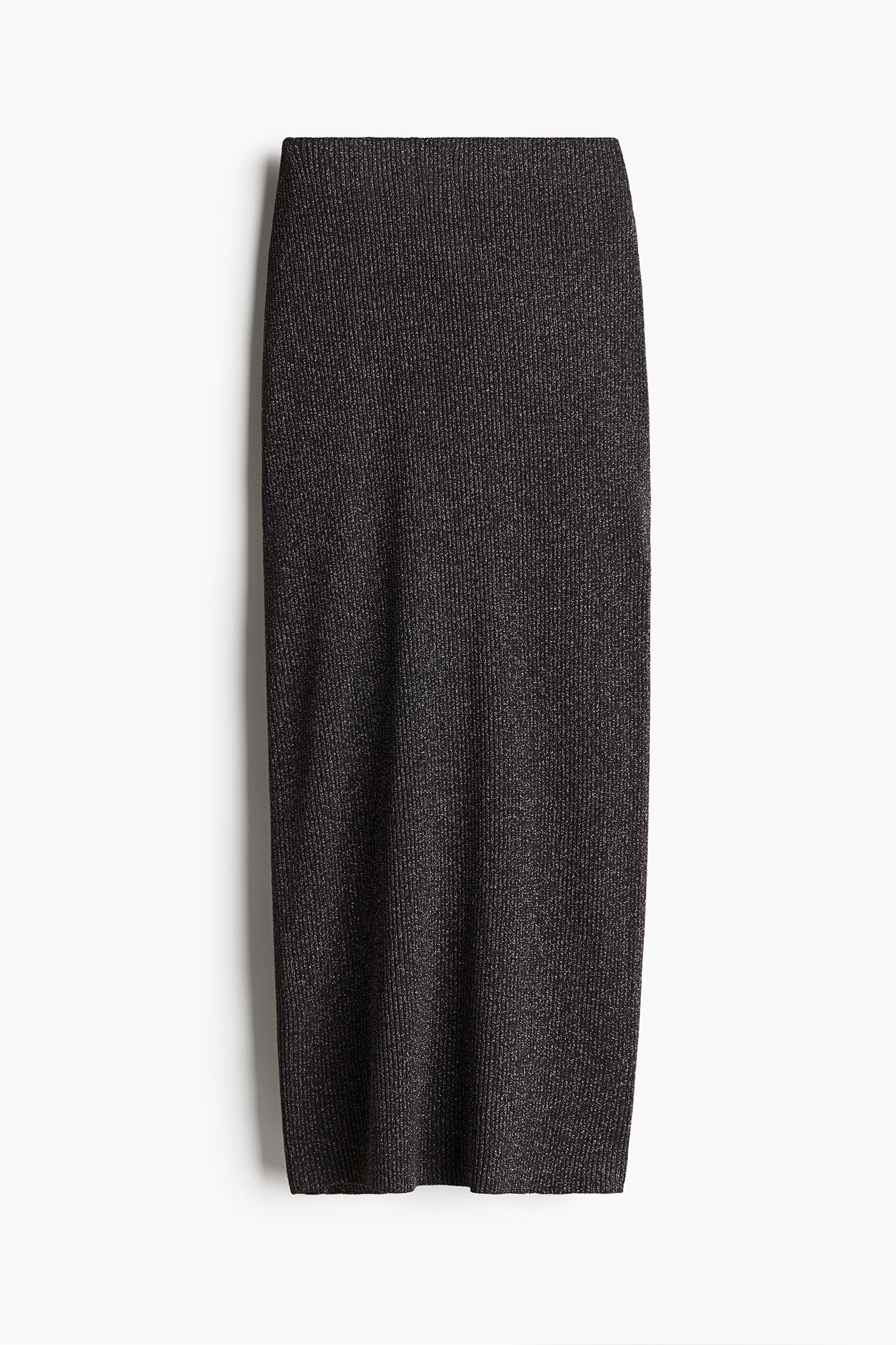 Приталенная юбка длиной до колен из трикотажа в рубчик с блестящими нитями. Высокая талия со скрытой резинкой и прямой подол.