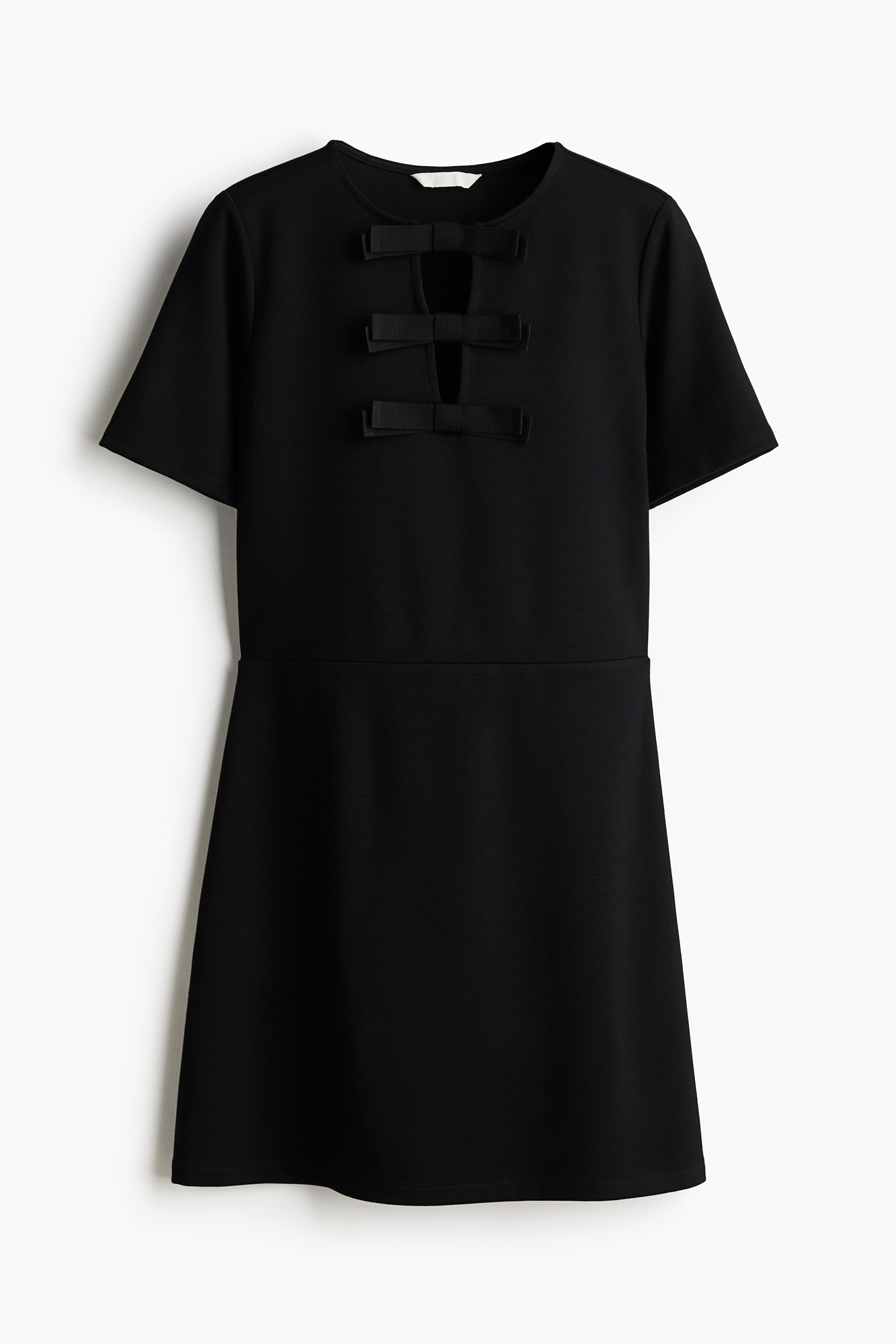 Короткое приталенное платье из плотного джерси с короткими рукавами, круглым вырезом и V-образной проймой с декоративными бантами из лент спереди.