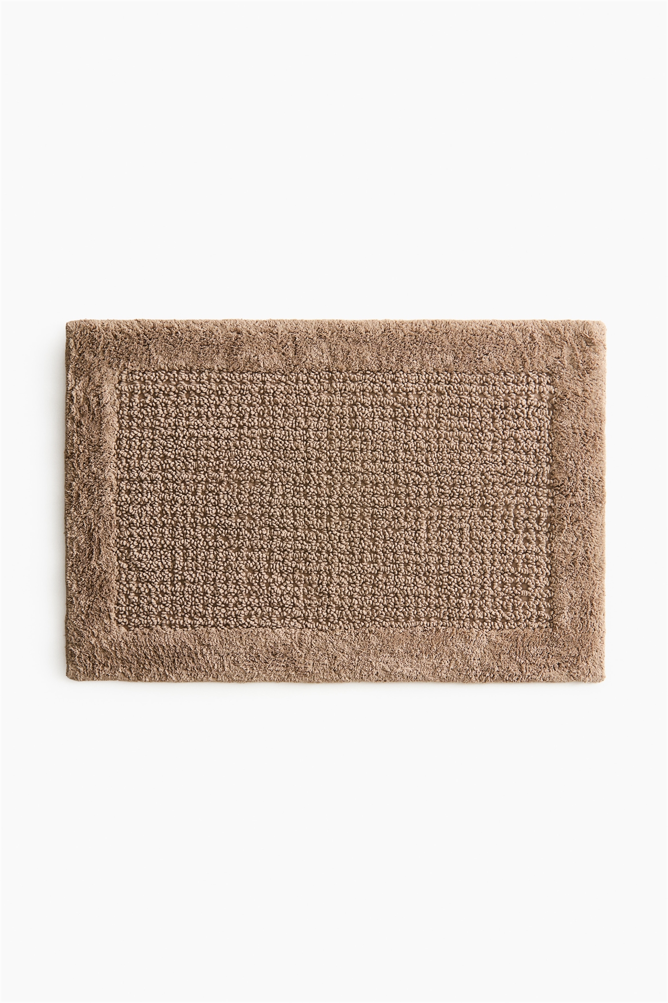 Хлопковый коврик для ванной со структурированной, геометрической центральной частью и ворсистым краем. Коврик ощущается под ногами как удивительно мягкий. Нескользящая изнанка.