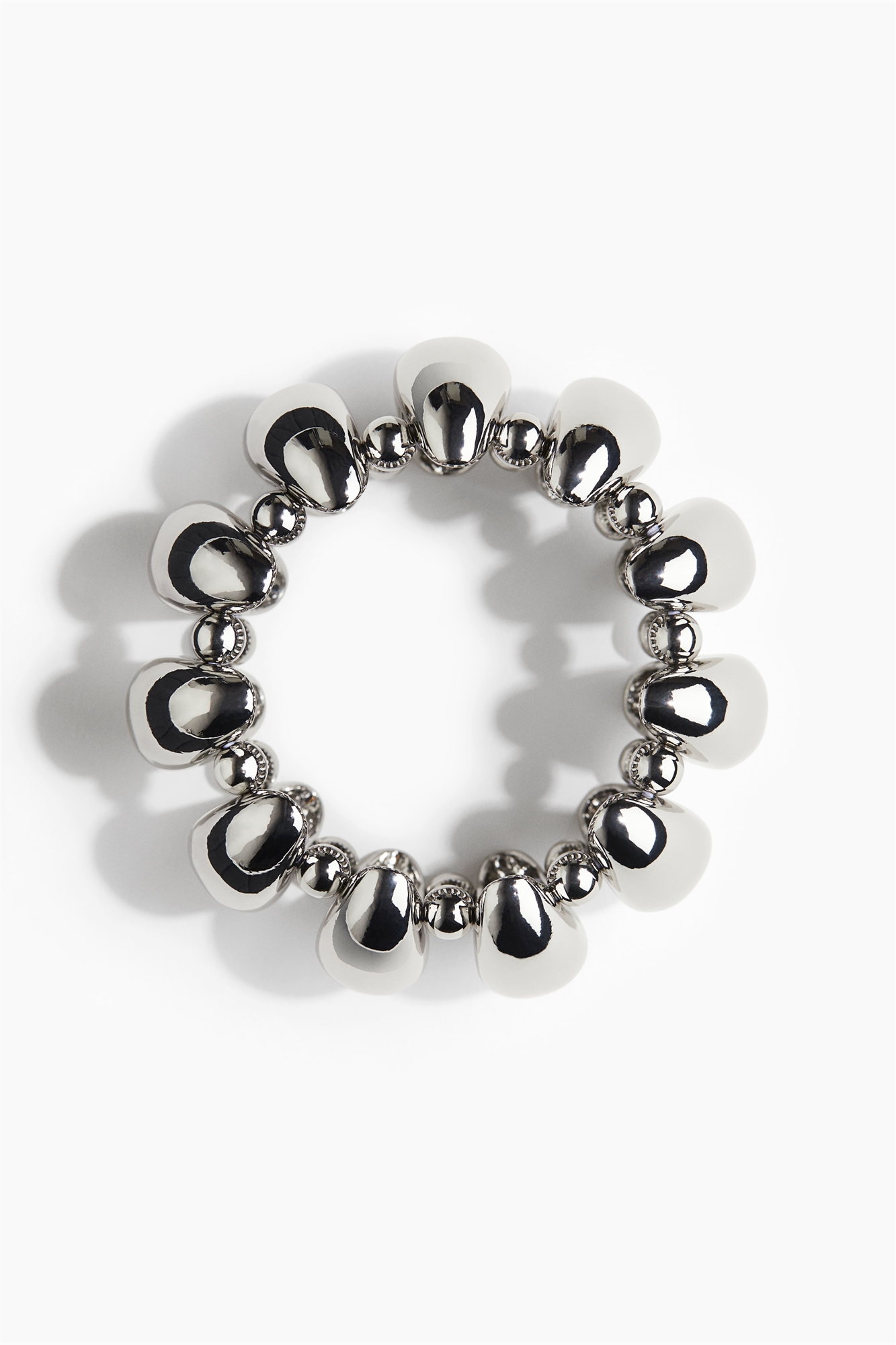 Широкий эластичный браслет с изогнутыми металлическими бусинами и маленькими пластиковыми бусинами между ними. Ширина 5 см.