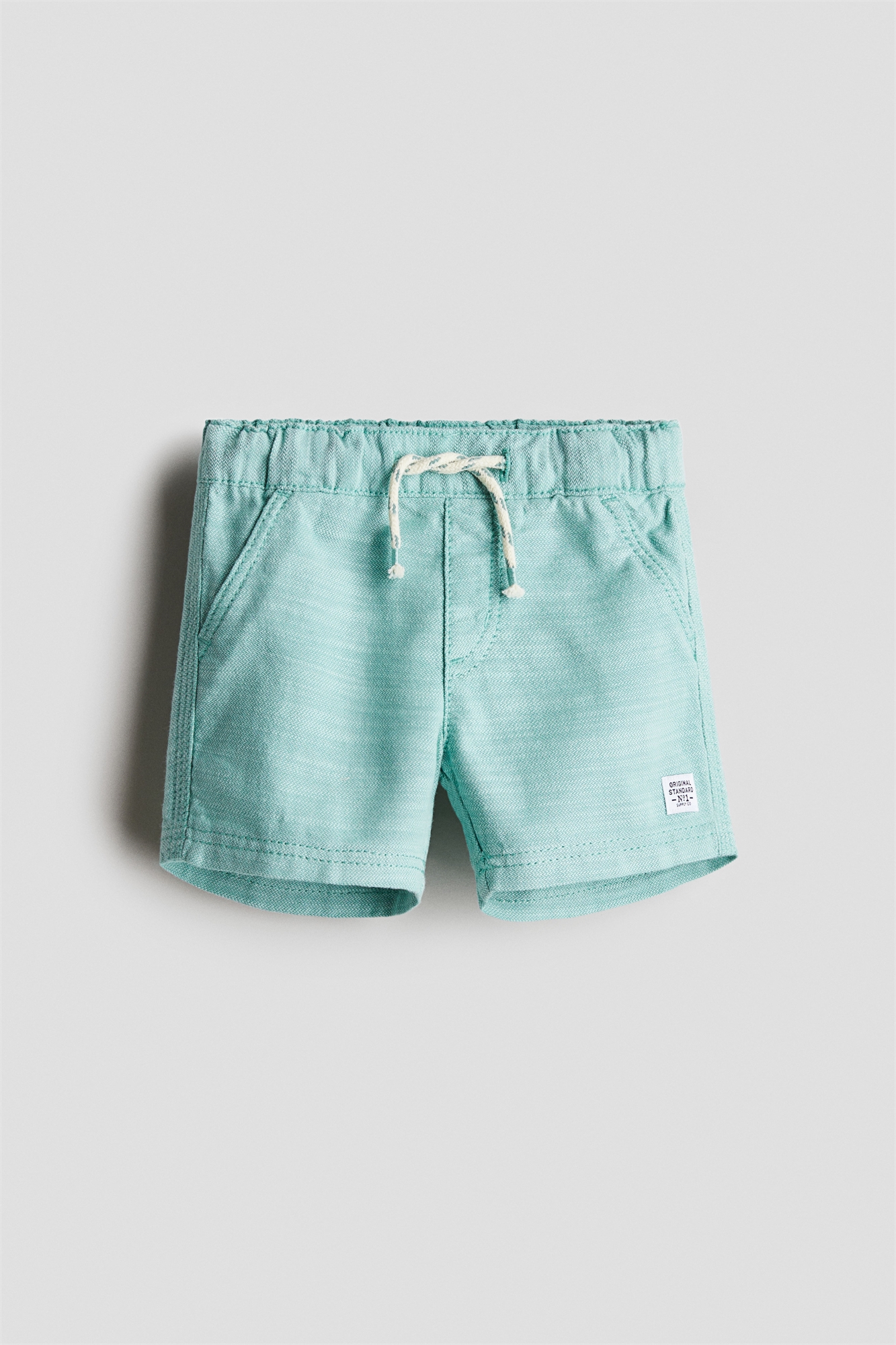 Шорты из мягкой саржи с декоративными карманами спереди и регулируемым эластичным поясом с утягивающим шнурком и фальшивой ширинкой.