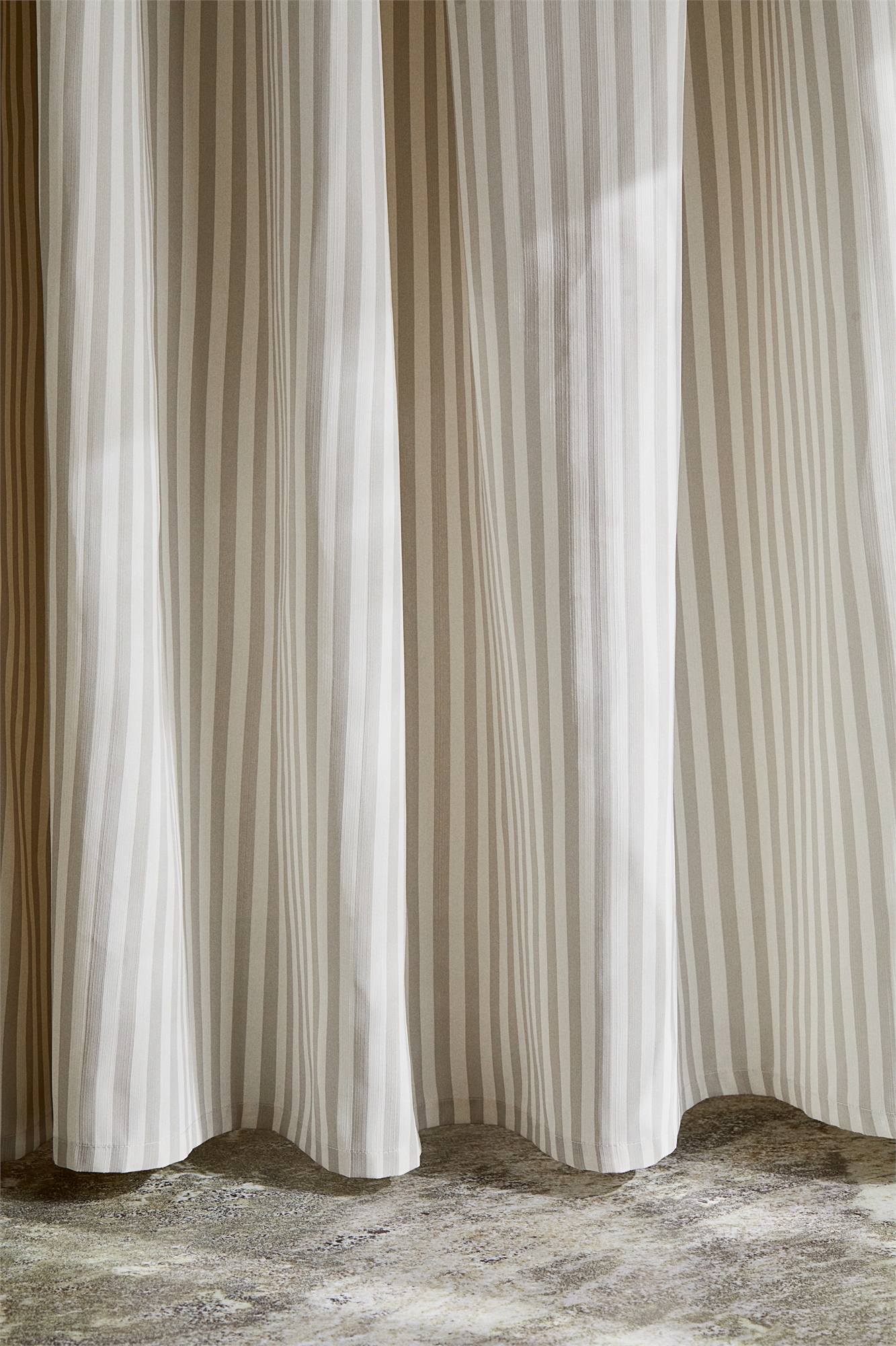 Полосатая занавеска для душа из водоотталкивающего полиэстера с фактурной отделкой. Металлические люверсы в верхней части. Кольца для шторки продаются отдельно.