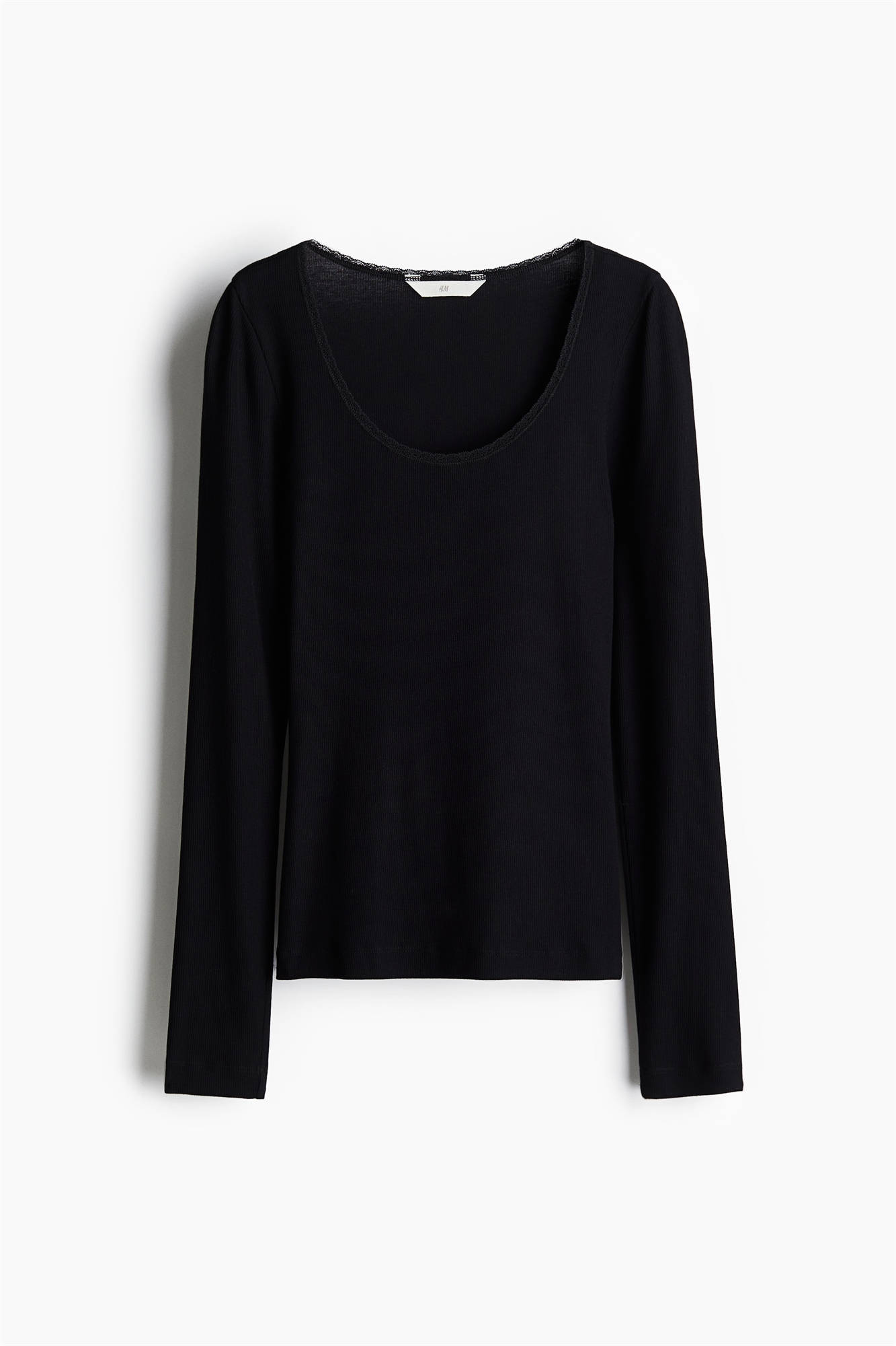 Облегающий топ с длинными рукавами из ребристого трикотажа с кружевной отделкой выреза "совок".
