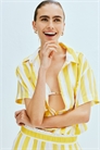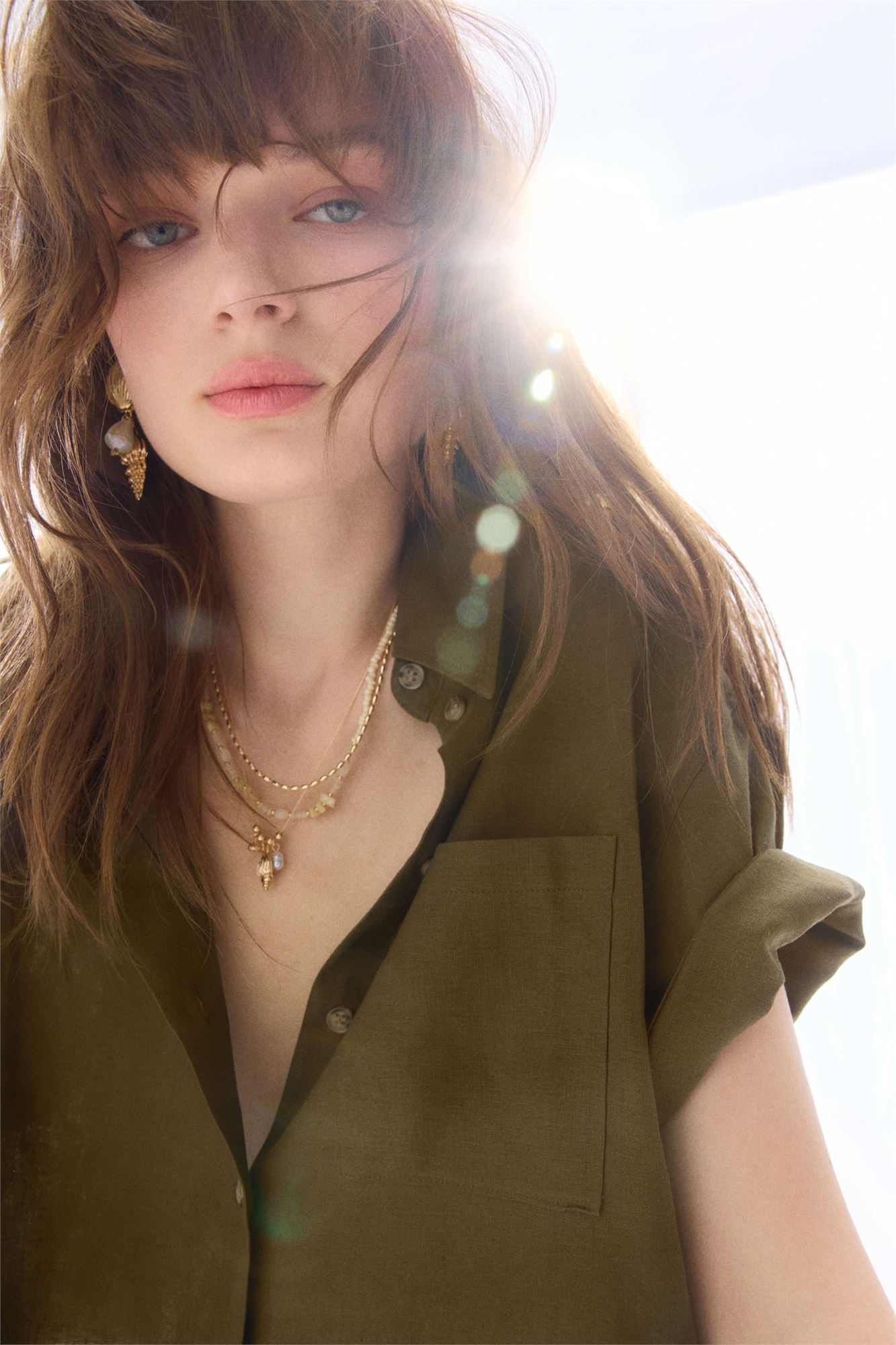 Короткая рубашка свободного покроя с воздушным плетением из смеси льна и вискозы. Воротник, пуговицы спереди, открытый нагрудный карман и короткие рукава. Сзади - складка и мягко закругленный подол.