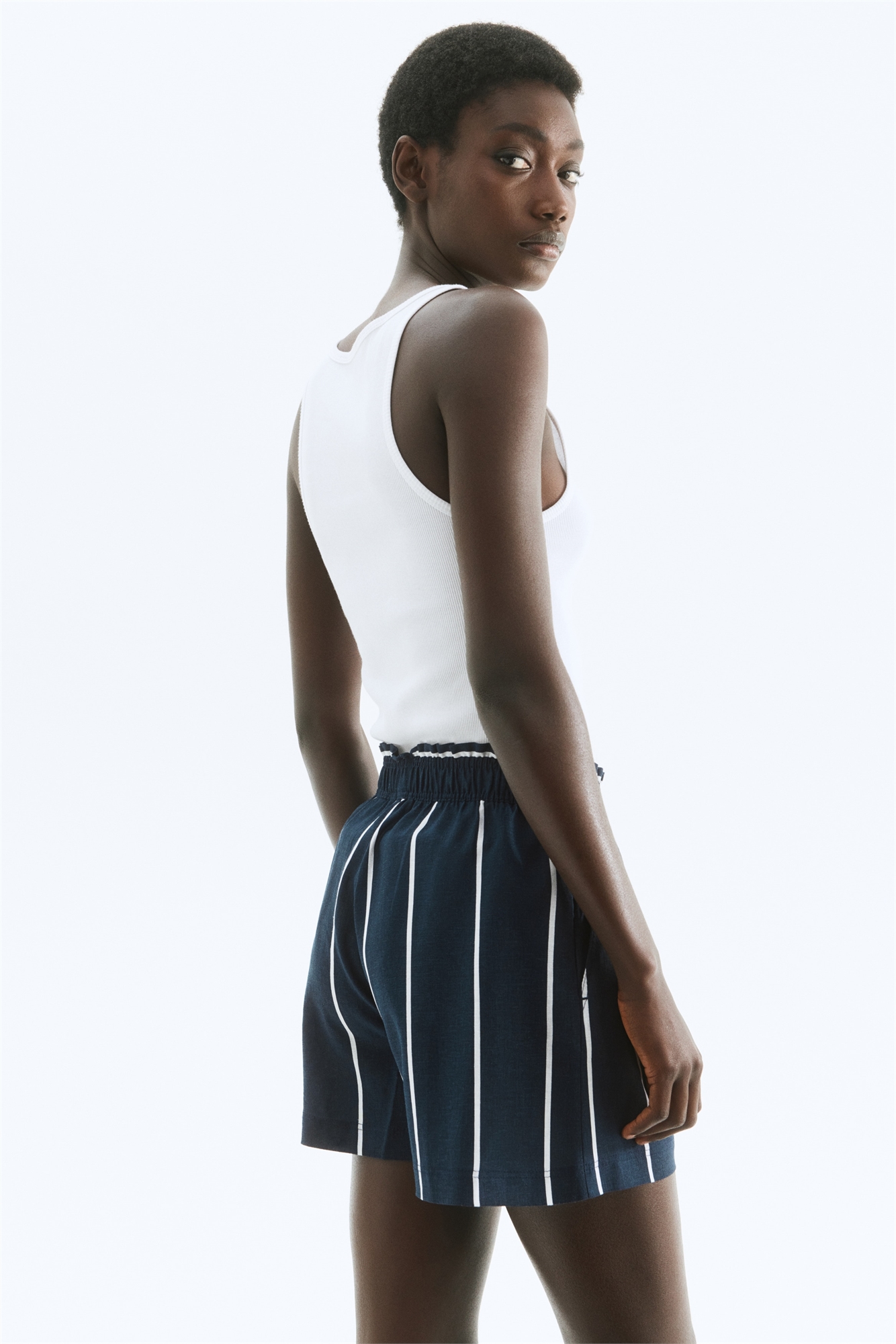 Свободные шорты из воздушного льняного и вискозного полотна с высокой талией, эластичной отделкой и узкой оборкой. Диагональные боковые карманы.