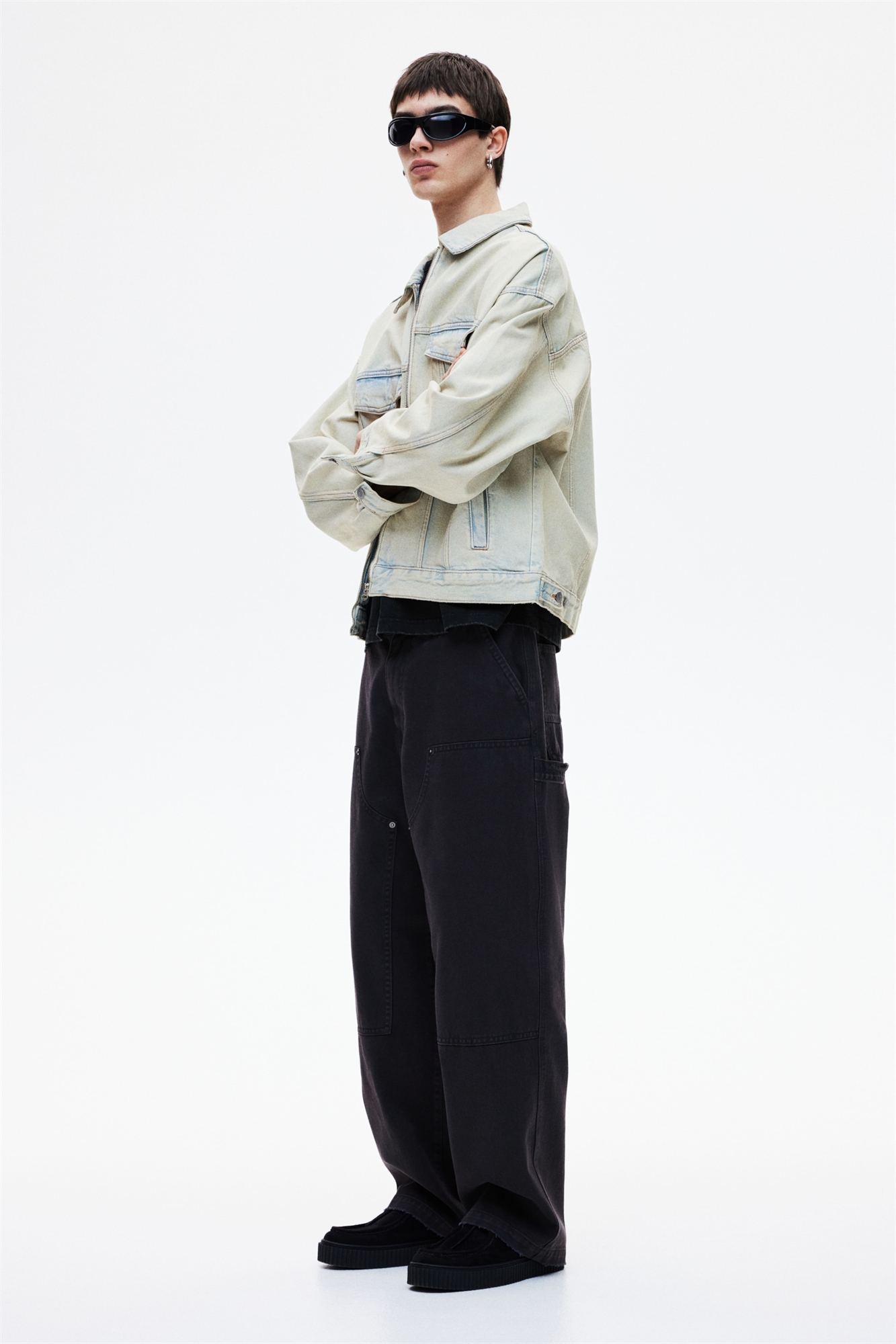 Плотницкие брюки из прочной хлопковой саржи с потертостями. Ширинка на молнии с пуговицей, ноги с большими коленями, петля для молотка на одной штанине и карман на другой штанине. Диагональные боковые карманы и открытые задние карманы. Мешковатый крой для непринужденного, но не чрезмерно большого силуэта.