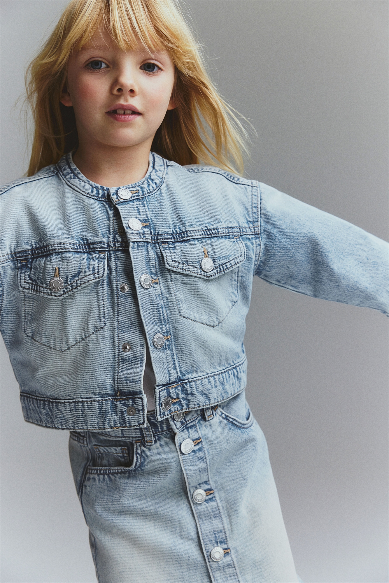 Куртка в стиле бокс из хлопкового денима с выстиранным внешним видом. Круглый вырез, спущенные плечи, застежки на кнопках спереди и на манжетах. Накладные нагрудные карманы с застежкой на кнопки.
