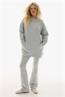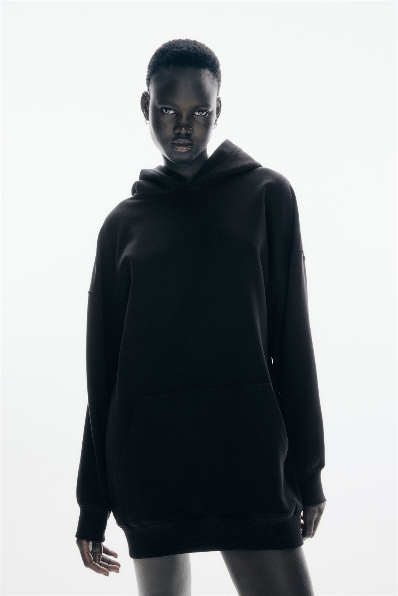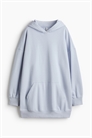 Короткое платье большого размера из толстовочной ткани с мягким начесом внутри. Капюшон на подкладке, низкие плечи и длинные рукава. Карман-кенгуру, манжеты и подол в рубчик.
