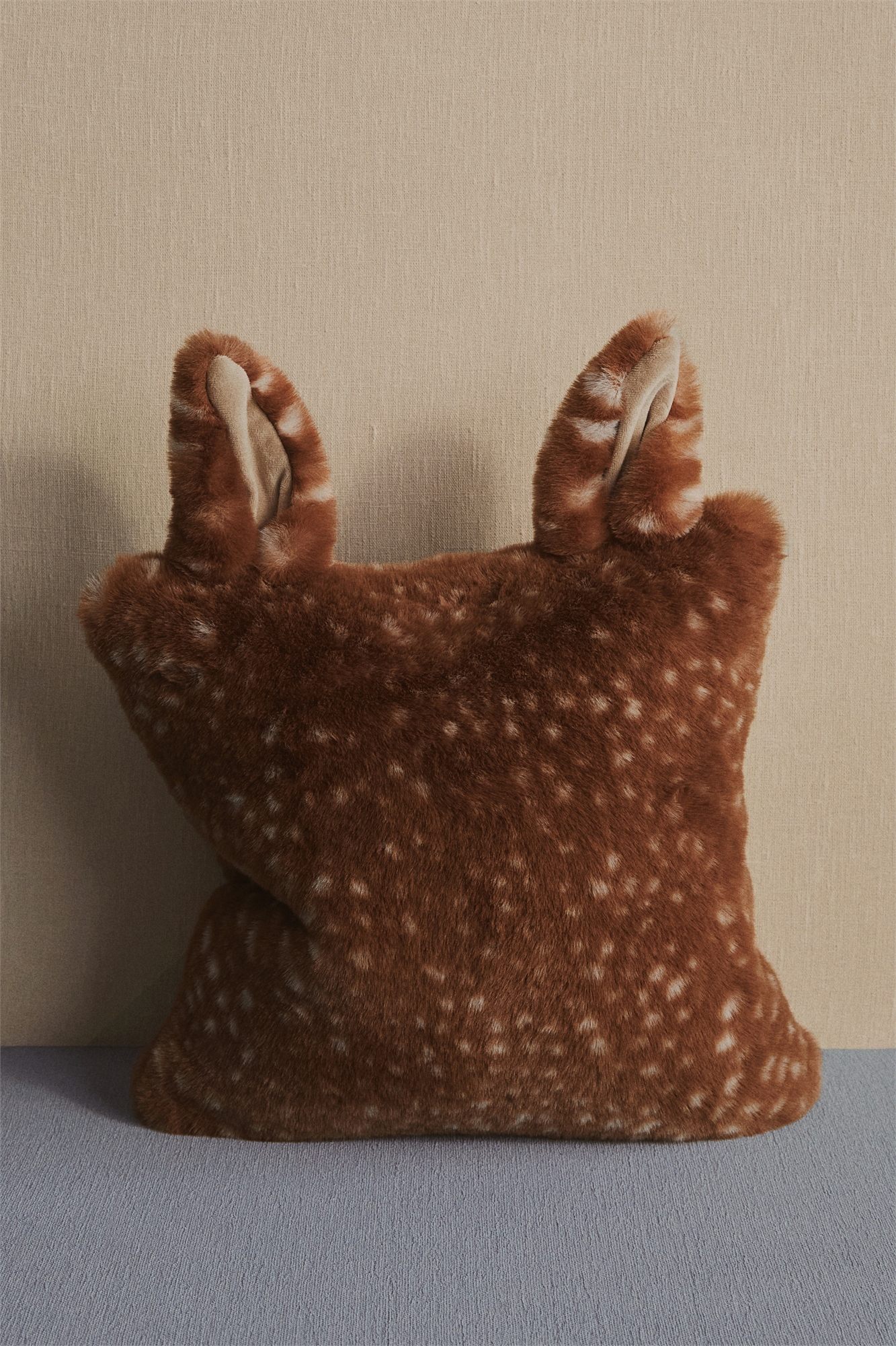 Пушистый чехол для подушки с принтом на всю поверхность спереди и сзади. Аппликации в виде ушей и застежка-молния внизу.