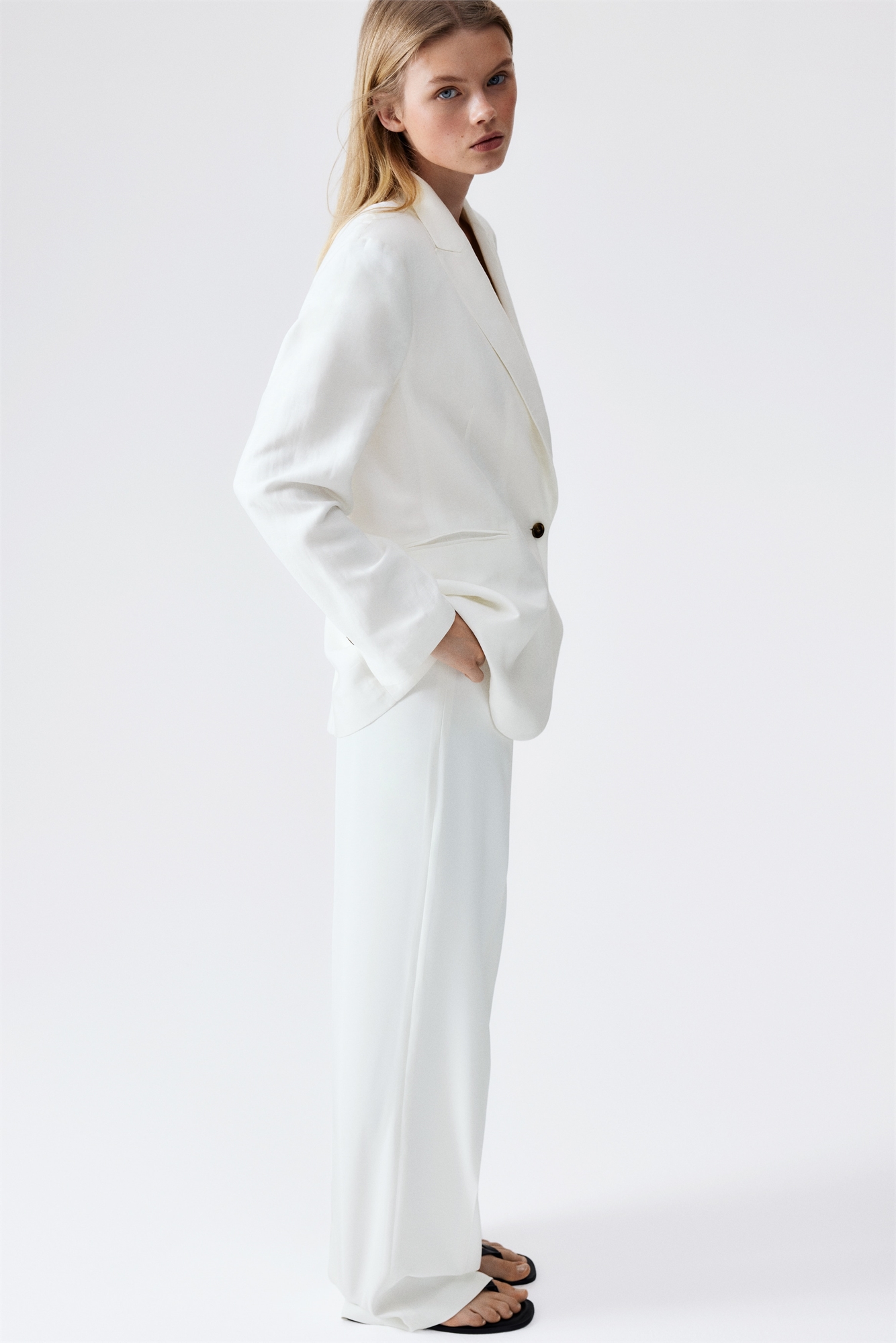 Приталенный однобортный блейзер из льна и вискозы. Пикообразные лацканы, пуговица спереди, талиевые вытачки и втачные передние карманы. Тонкие подплечники, разрез и пуговица на манжетах и один задний клапан. На подкладке.