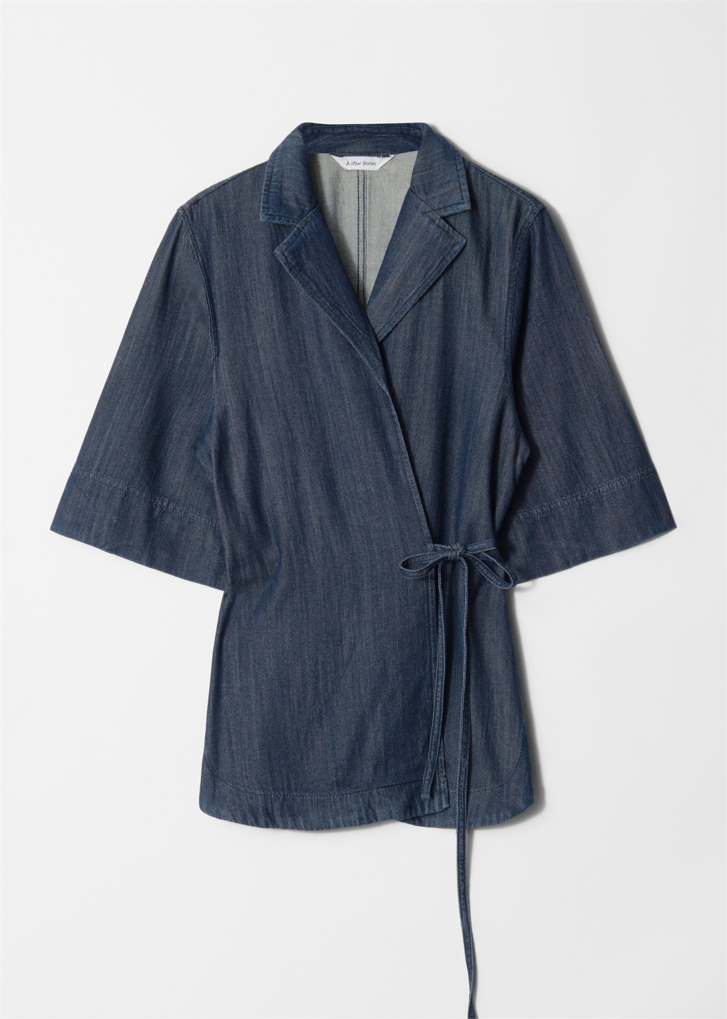 Джинсовая рубашка приталенного силуэта. Классический воротник, рукава три четверти с широкими манжетами и завязка на талии. • Regular fit Длина рубашки: 73 см / 28,7" (размер S)