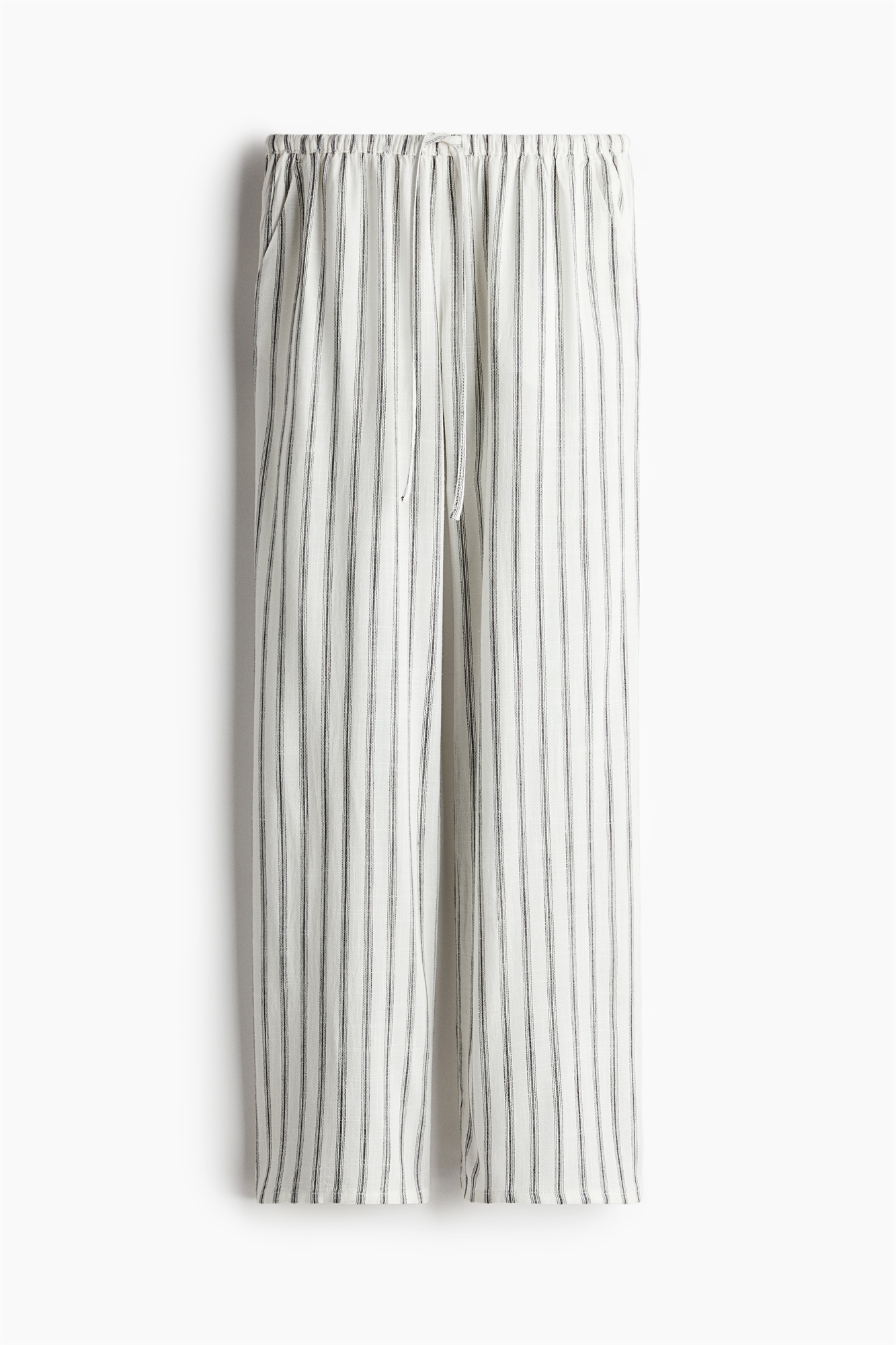 Брюки из воздушного полотна с добавлением льна с заниженной талией с эластичной отделкой и утягивающим шнурком. Диагональные боковые карманы и прямые ноги.