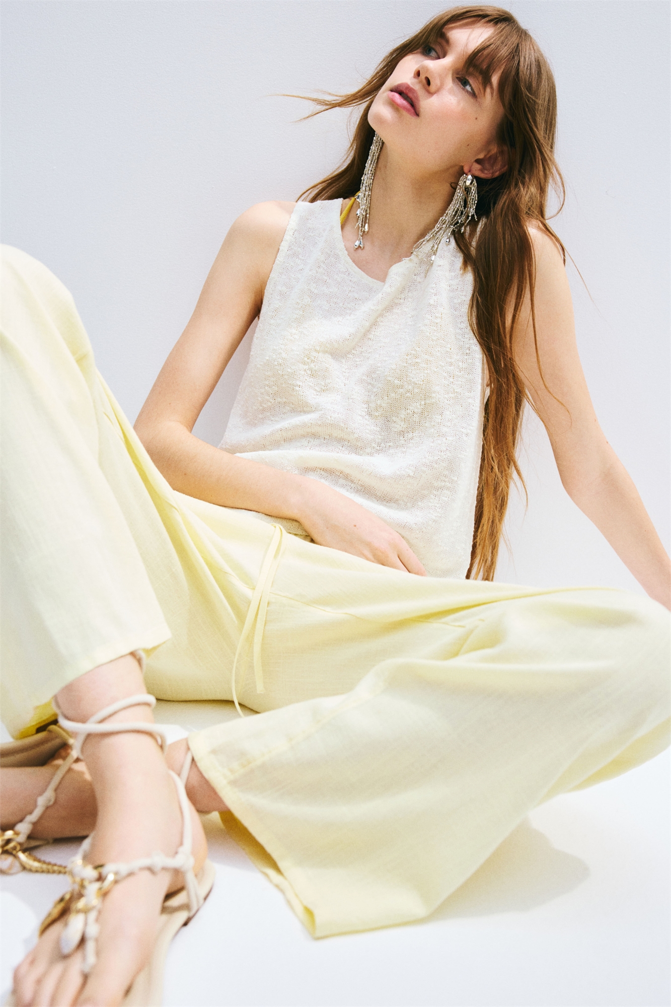 Брюки из воздушного полотна с добавлением льна с заниженной талией с эластичной отделкой и утягивающим шнурком. Диагональные боковые карманы и прямые ноги.