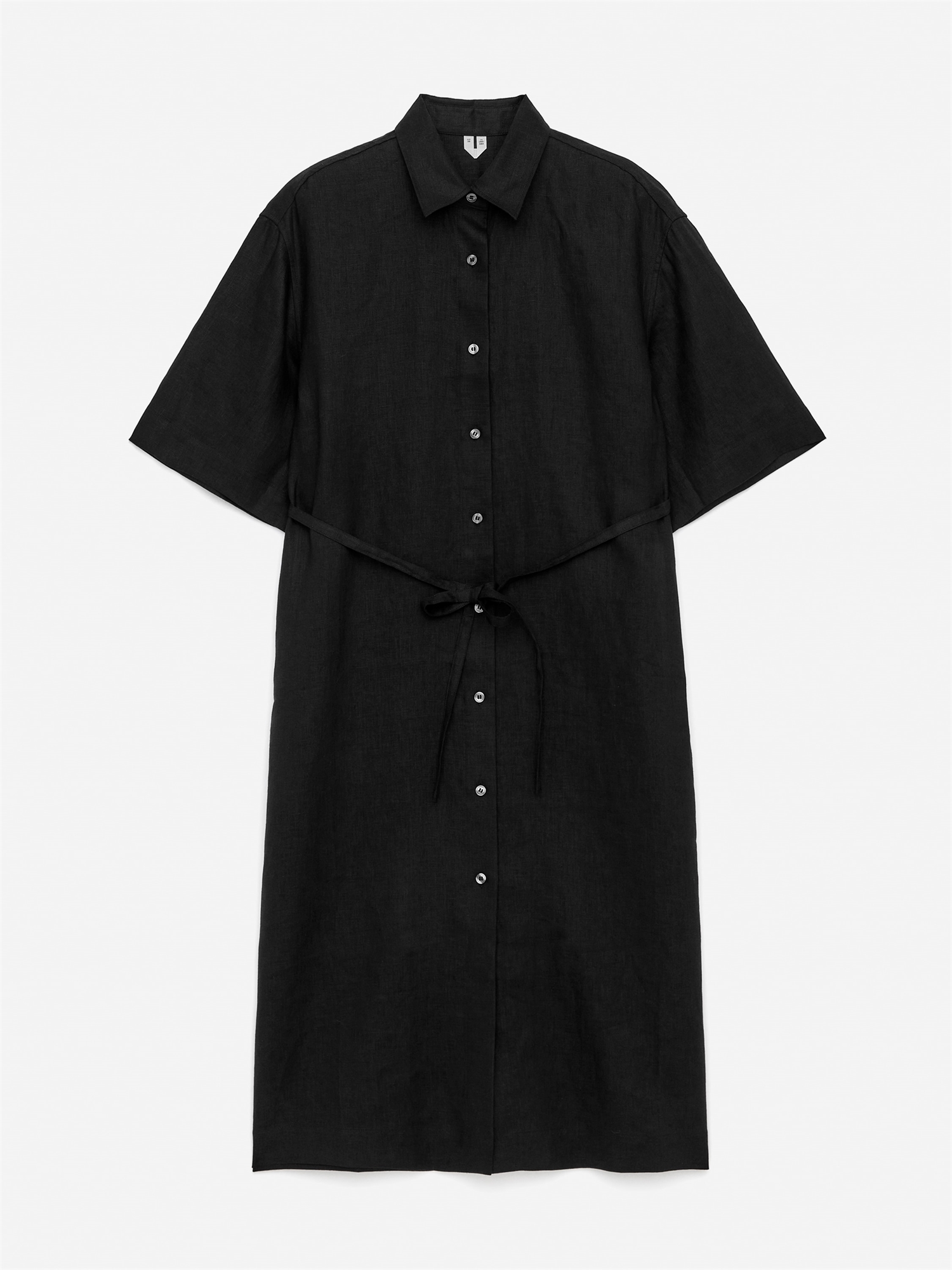 Платье-рубашка средней длины из льна. Модель дополнена карманами в боковых швах и завязывающимся поясом на талии.
