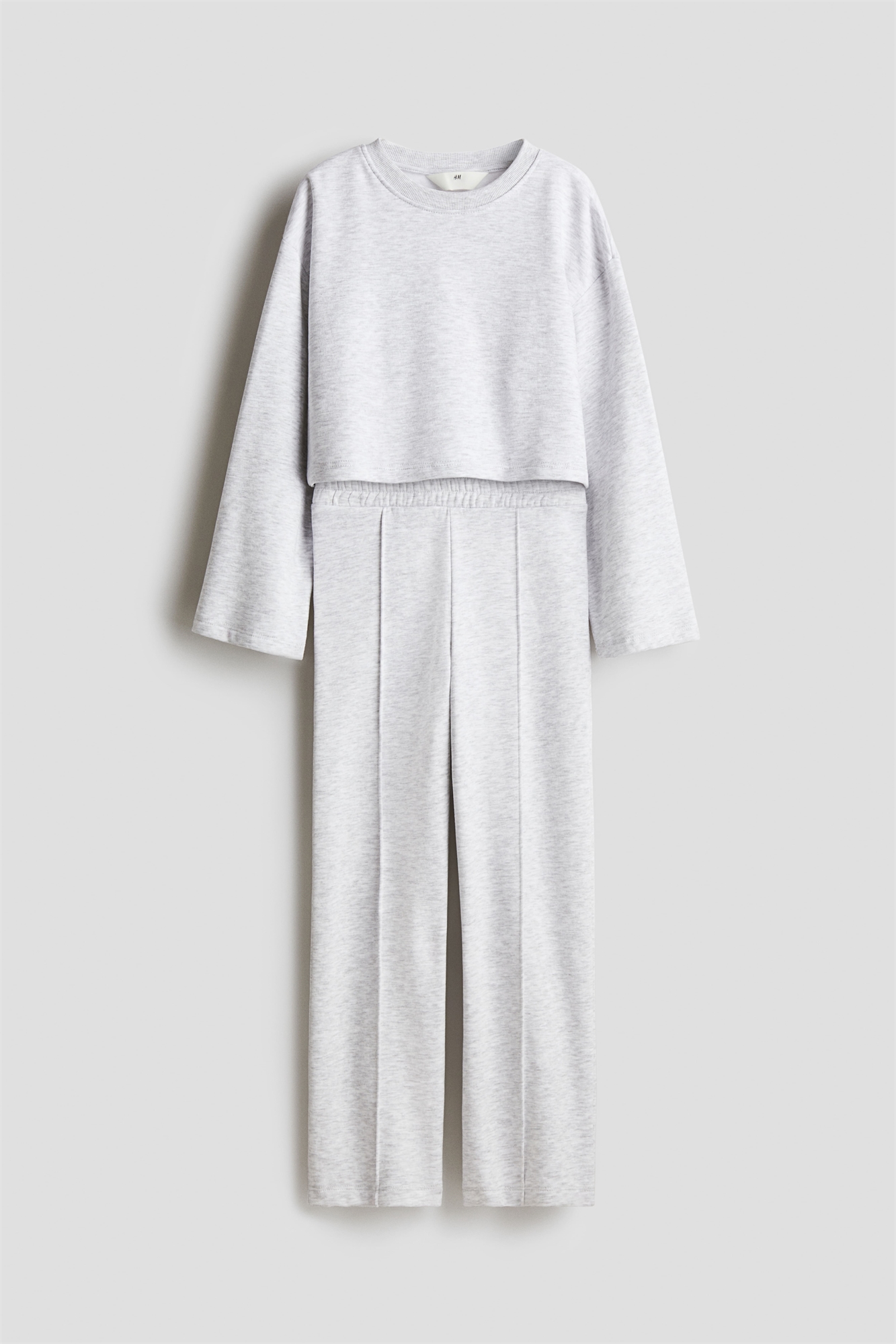 Комплект из топа и джоггеров из толстовки с мягкой ворсистой внутренней стороной. Топ с круглым ребристым вырезом, спущенными плечами и длинными рукавами. Джоггеры с эластичной талией и широкими штанинами с пинетками спереди.