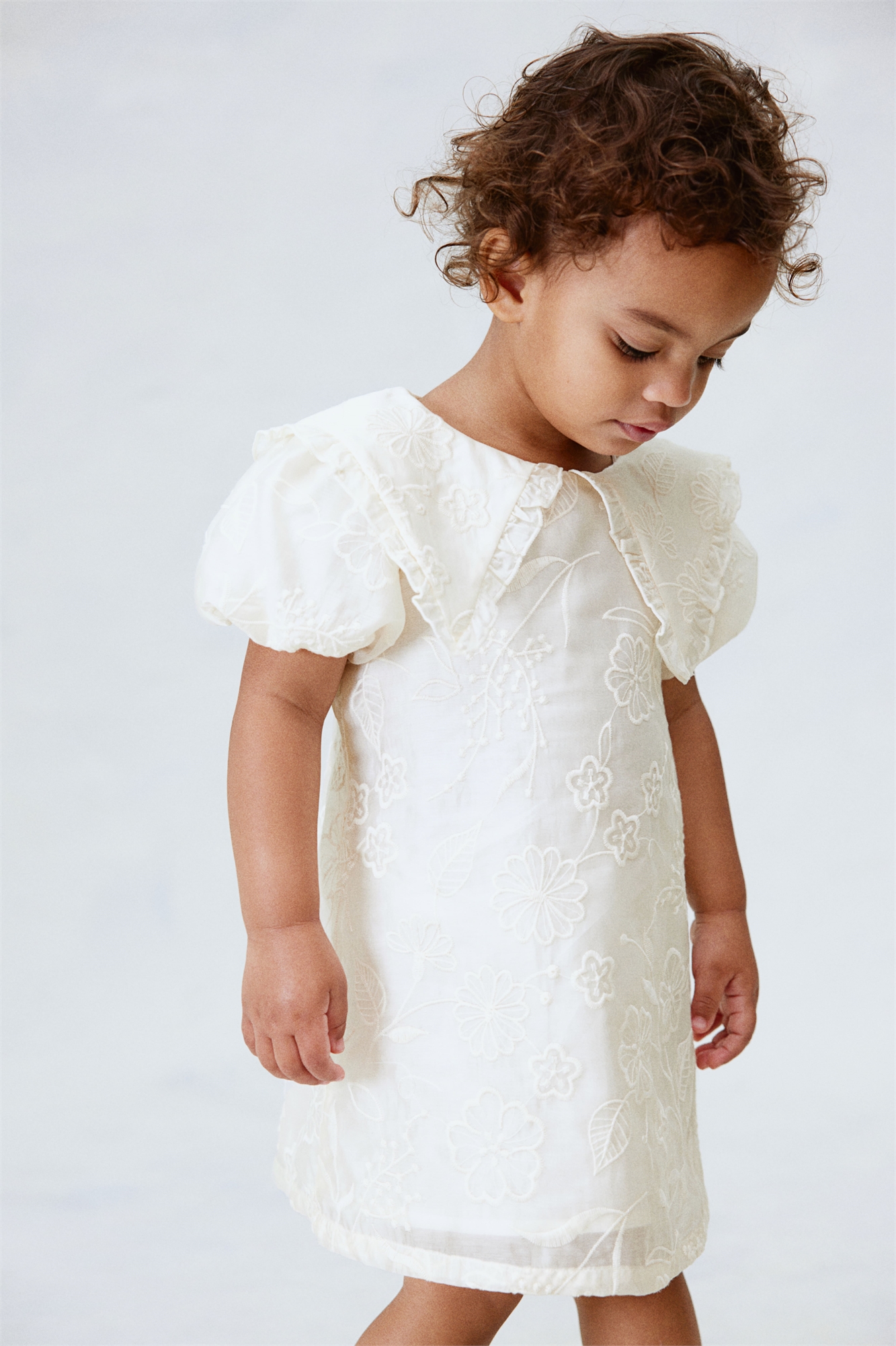 H&M Adorables. Платье А-линии из мягкого хлопкового микса с нежной вышивкой. Большой острый воротник с оборкой, объемные пышные рукава и прорезь для ключа с пуговицей сзади. На подкладке. Коллекция H&M Adorables - это подборка удобных и качественных вещей, не теряющих актуальности.