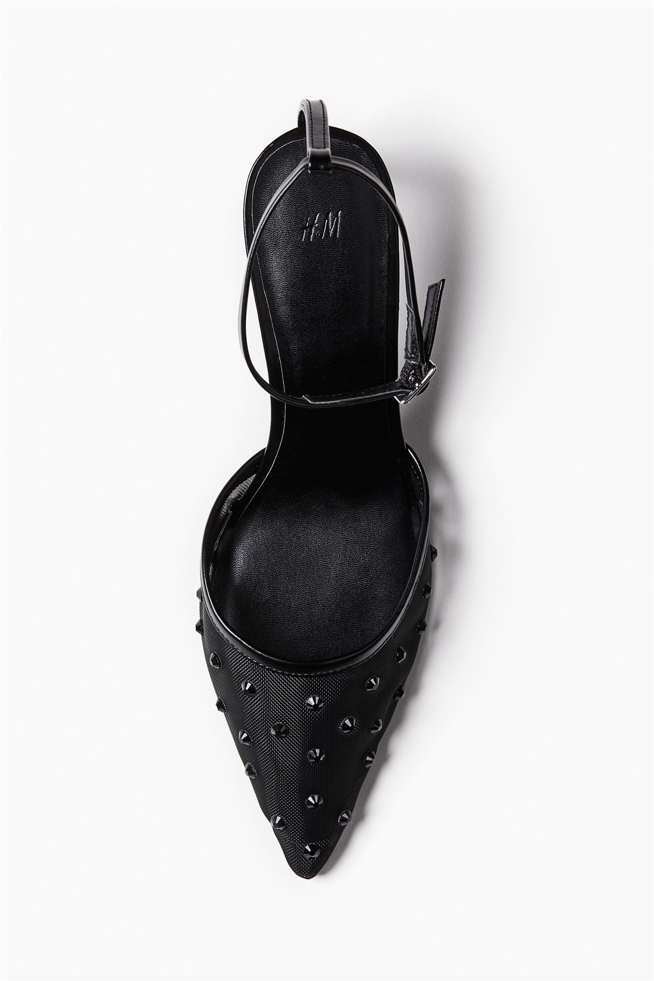 Туфли из сетки с заостренными мысками, украшенными стразами. Узкий закрытый каблук и узкий регулируемый ремешок на щиколотке с металлической пряжкой. Каблук 6,5 см.