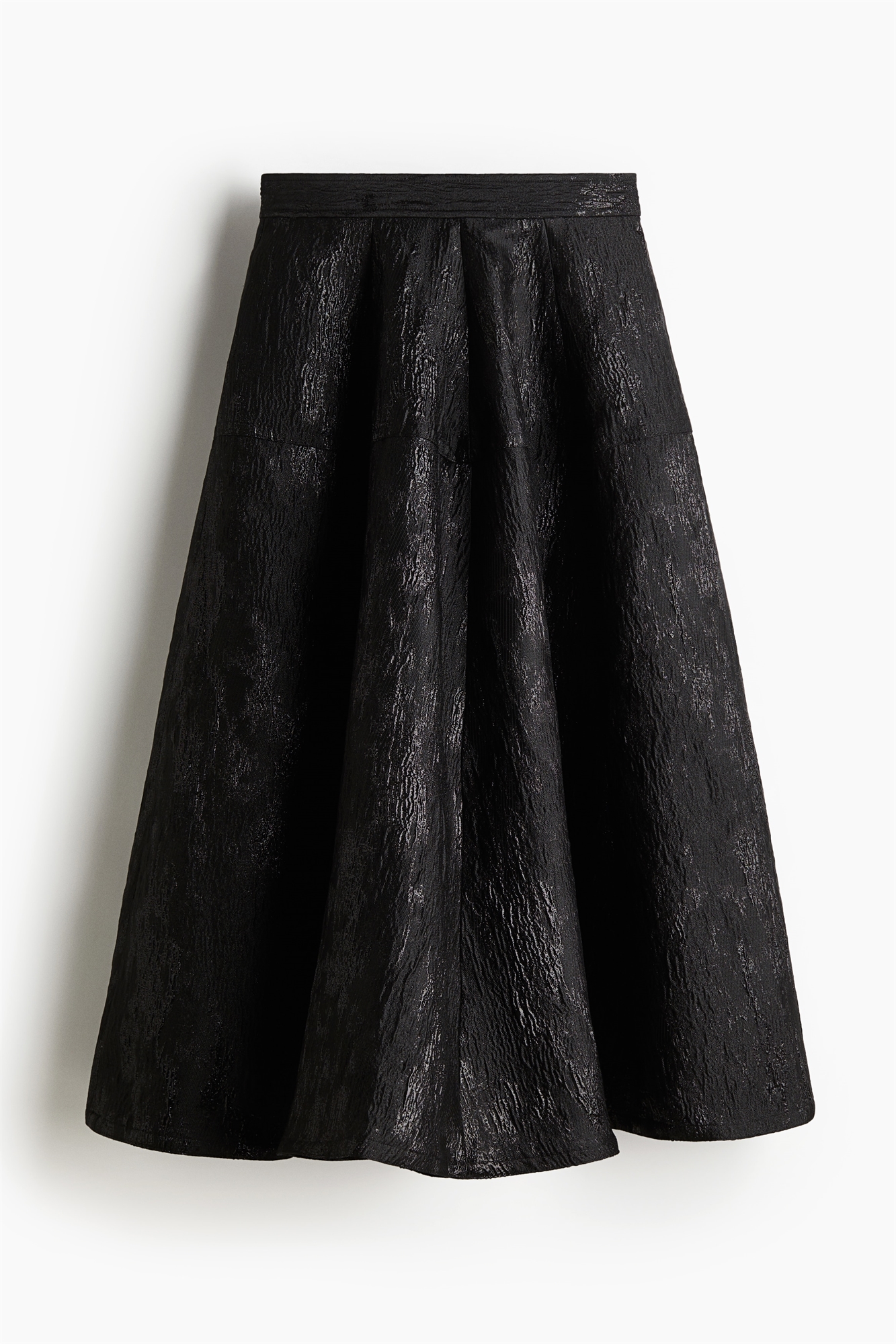 Объемная юбка длиной до колен из жаккардового переплетения с блестящими нитями. Высокая талия, потайная застежка на молнию и крючок с одной стороны. Незаметные боковые карманы и видимый шов ниже бедра. На подкладке.