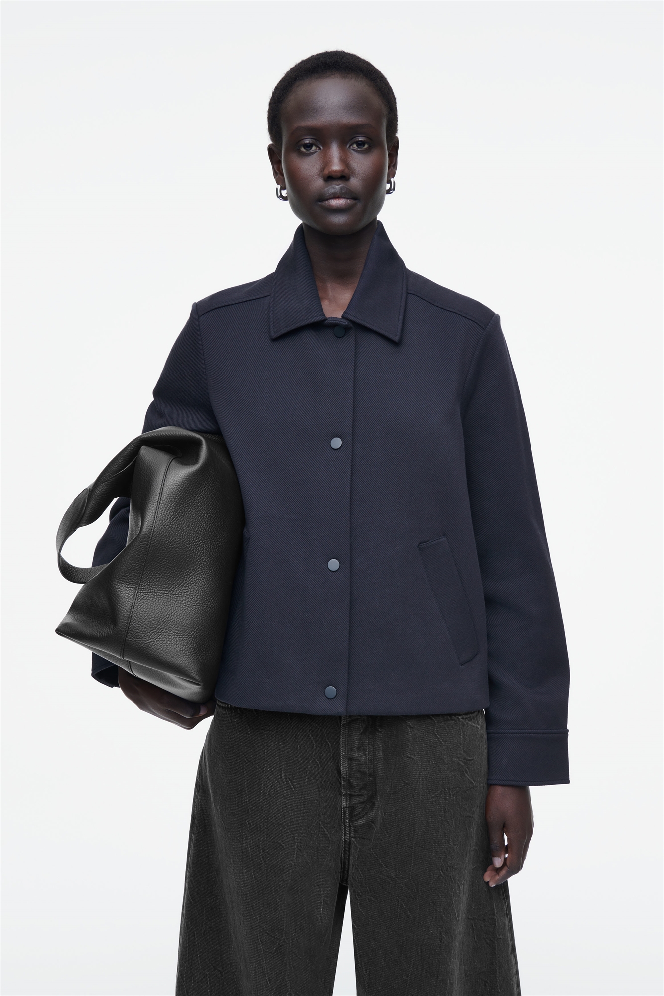Эта современная куртка с силуэтом трапеция, застегивающаяся на пуговицы на талии, и практичными карманами - изысканный подход к практичности. Она изготовлена из хлопковой саржи универсального темно-синего цвета, имеет отложной заостренный воротник и серебристые кнопки. Регулярный крой Застежка на кнопки Переработанный нейлон снижает потребность в ограниченных природных ресурсах и сокращает выбросы парниковых газов Ткань: 81% хлопка, 16% переработанного полиамида (переработанный нейлон), 3% переработанного эластана. Подкладка: 100% хлопок. Без учета отделки / Машинная стирка Длина по спинке для размера S составляет 56,5 см / Модель носит размер S