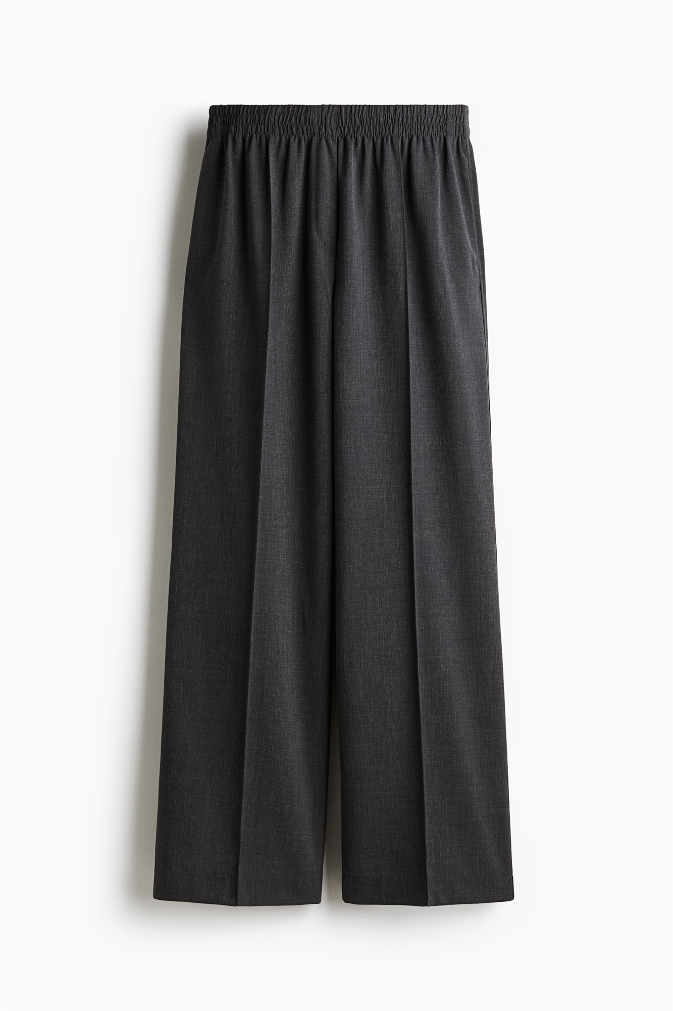 Брюки из саржи с высокой эластичной талией, фальшивой ширинкой и неброскими боковыми карманами. Широкие штанины с застроченными складками спереди и вдавленными складками сзади.