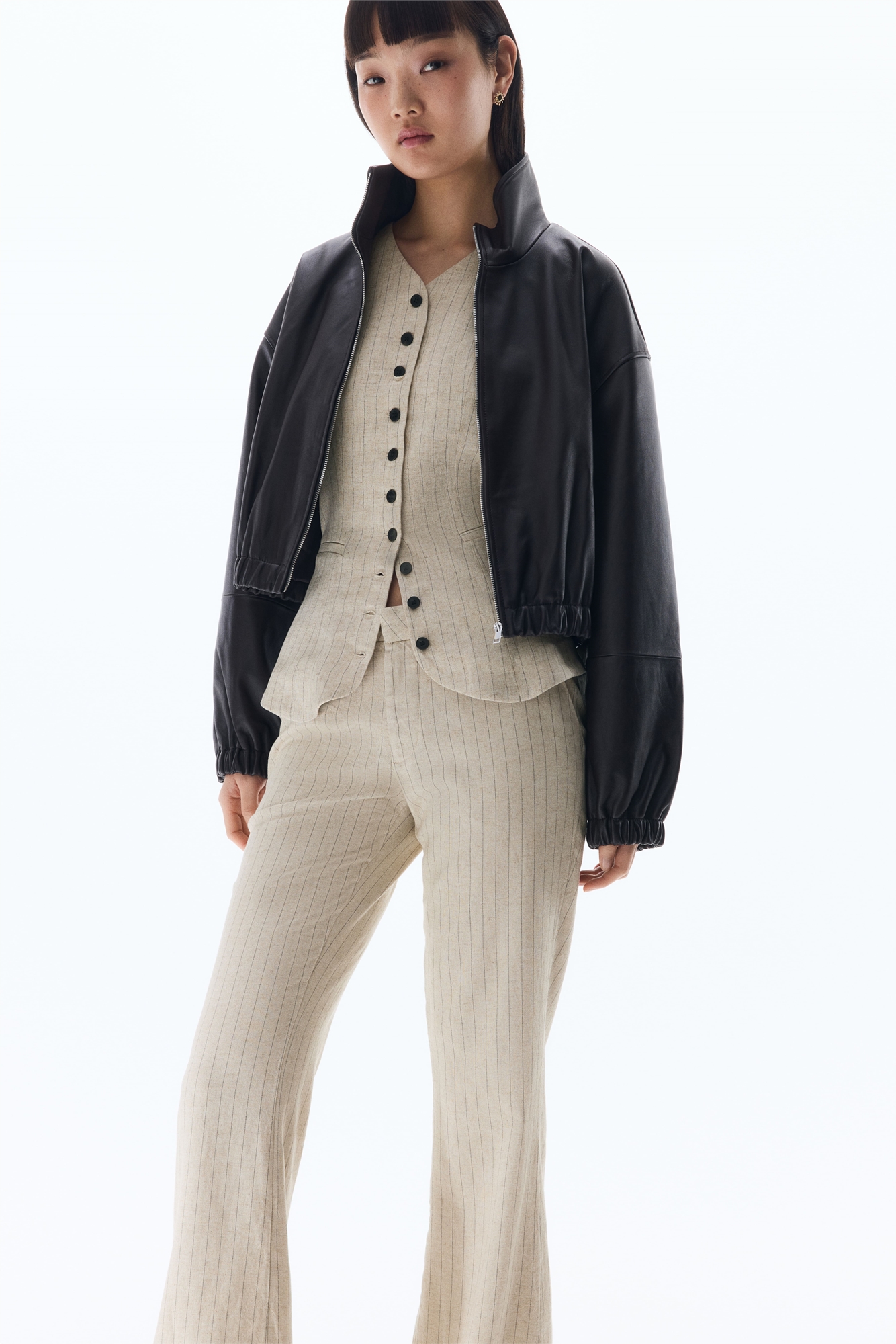 Брюки с воздушным плетением из смеси льна и вискозы. Регулярная талия, ширинка на молнии и пуговице, диагональные боковые карманы и втачные карманы сзади. Ноги с расклешенными подолами.