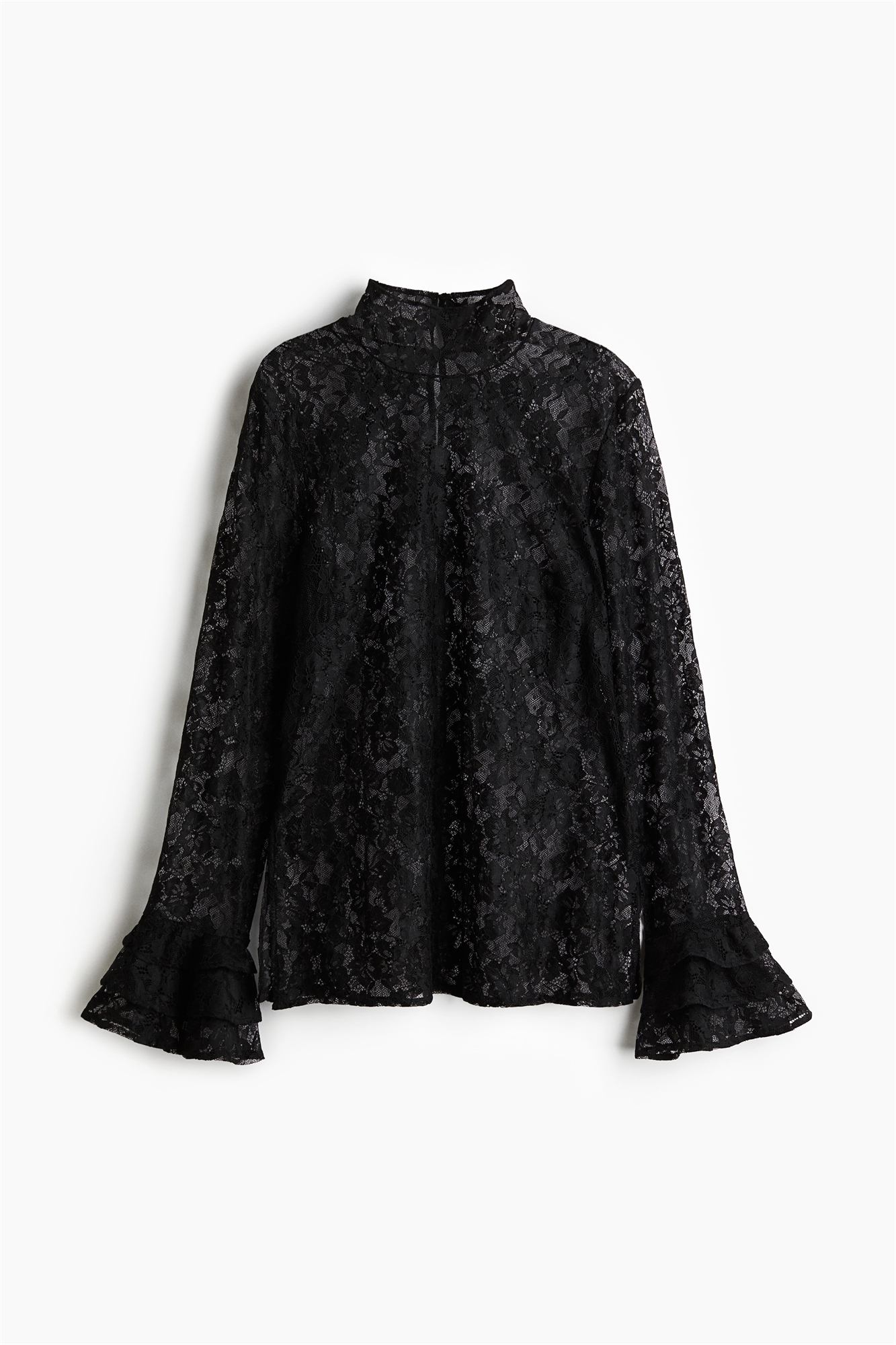 Приталенная блузка из кружева с воротником-стойкой и прорезью для ключа с застежками-крючками сзади на шее. Длинные рукава с манжетами с воланами и подол прямого кроя с разрезом с каждой стороны. Без подкладки.