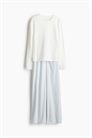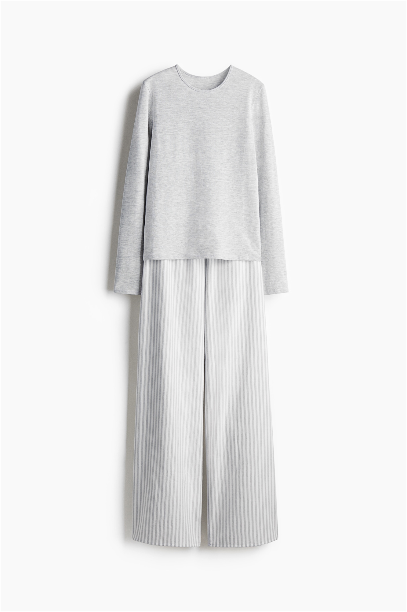 Пижама с верхом из мягкого трикотажа и низом из хлопковой саржи. Верхняя часть с круглым вырезом и длинными рукавами. Низкие брюки с широкими штанинами, эластичной резинкой на талии, незаметными боковыми карманами и фальшивой ширинкой с видимыми пуговицами.