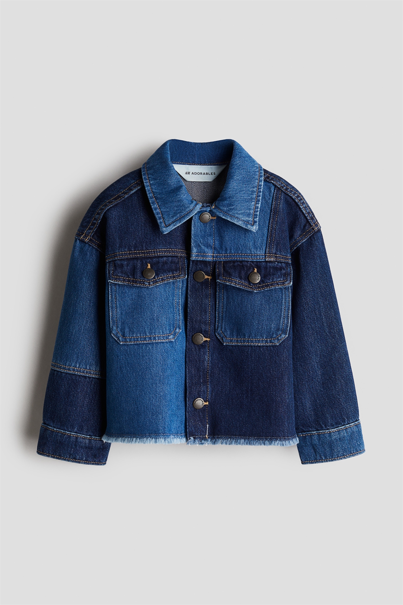 H&M Adorables. Куртка блочного цвета из мягкого денима с заплатками из смеси хлопка. Куртка в боксерском стиле с воротником, застежками на кнопки спереди и на манжетах, нагрудными карманами с клапаном и застежкой на кнопки. Прямой покрой, обтрепанный подол. Коллекция H&M Adorables - это подборка удобных и качественных вещей, которые не подвластны времени.