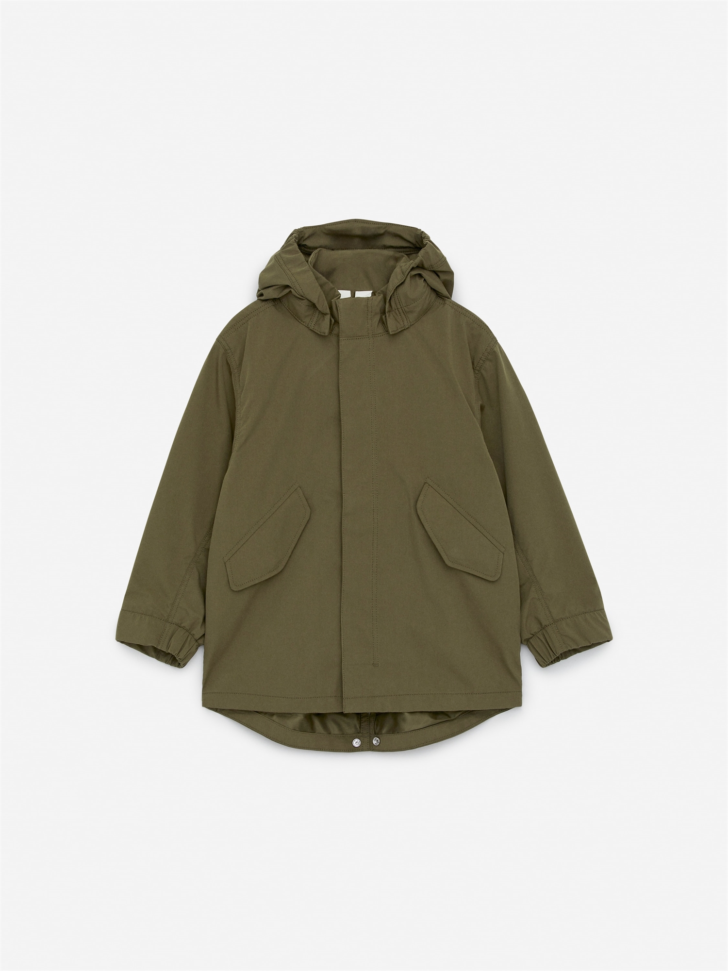 Парка с металлической застежкой на молнию и скрытыми кнопками. Накладные карманы с клапанами и скрытыми кнопками. Эластичные манжеты и талия. Съемный капюшон с металлическими кнопками.