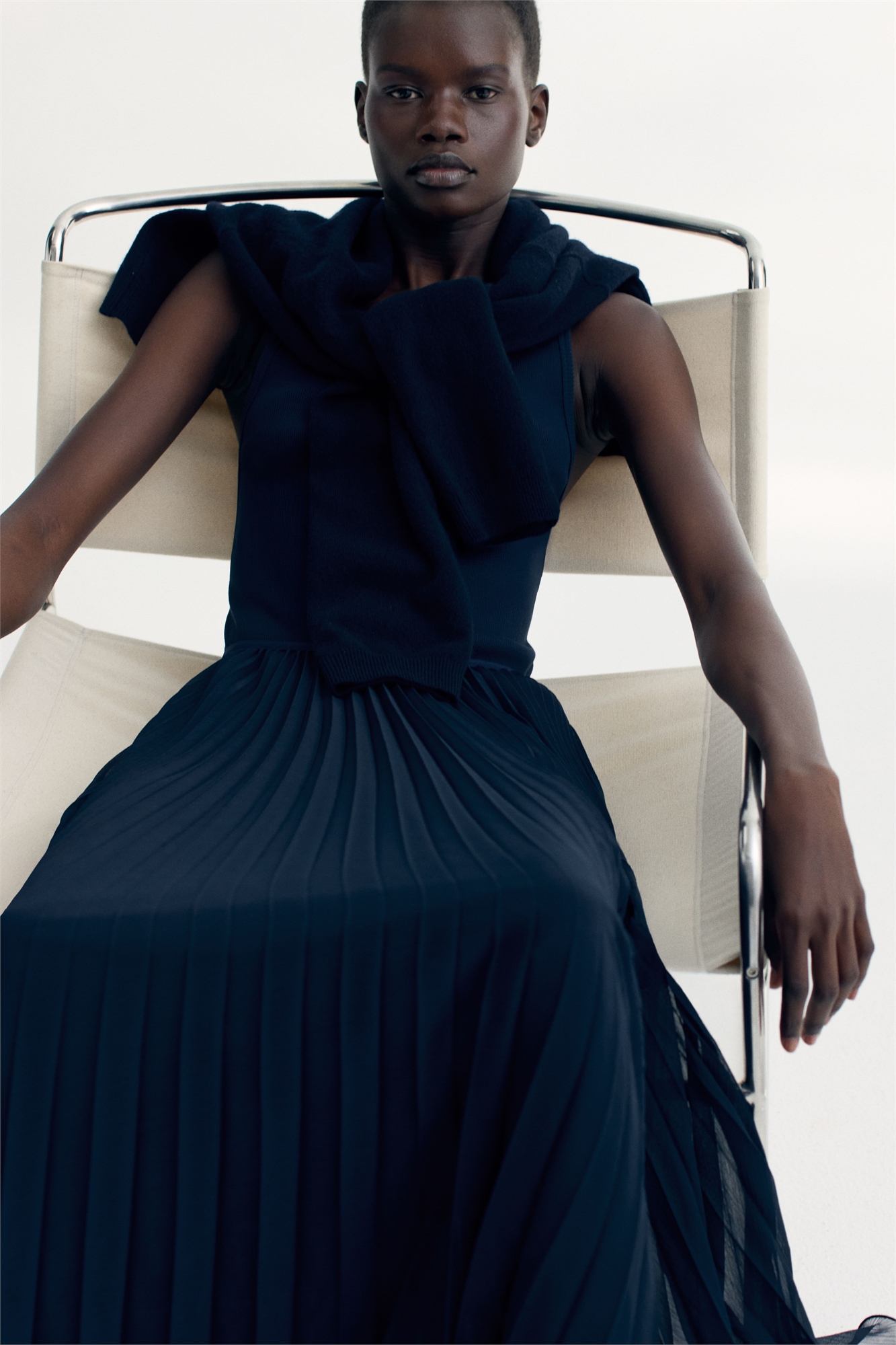 Свободная юбка длиной до щиколоток из плиссированного полотна с высокой талией и узким эластичным поясом. Асимметричный подол с оверлоком. На подкладке.