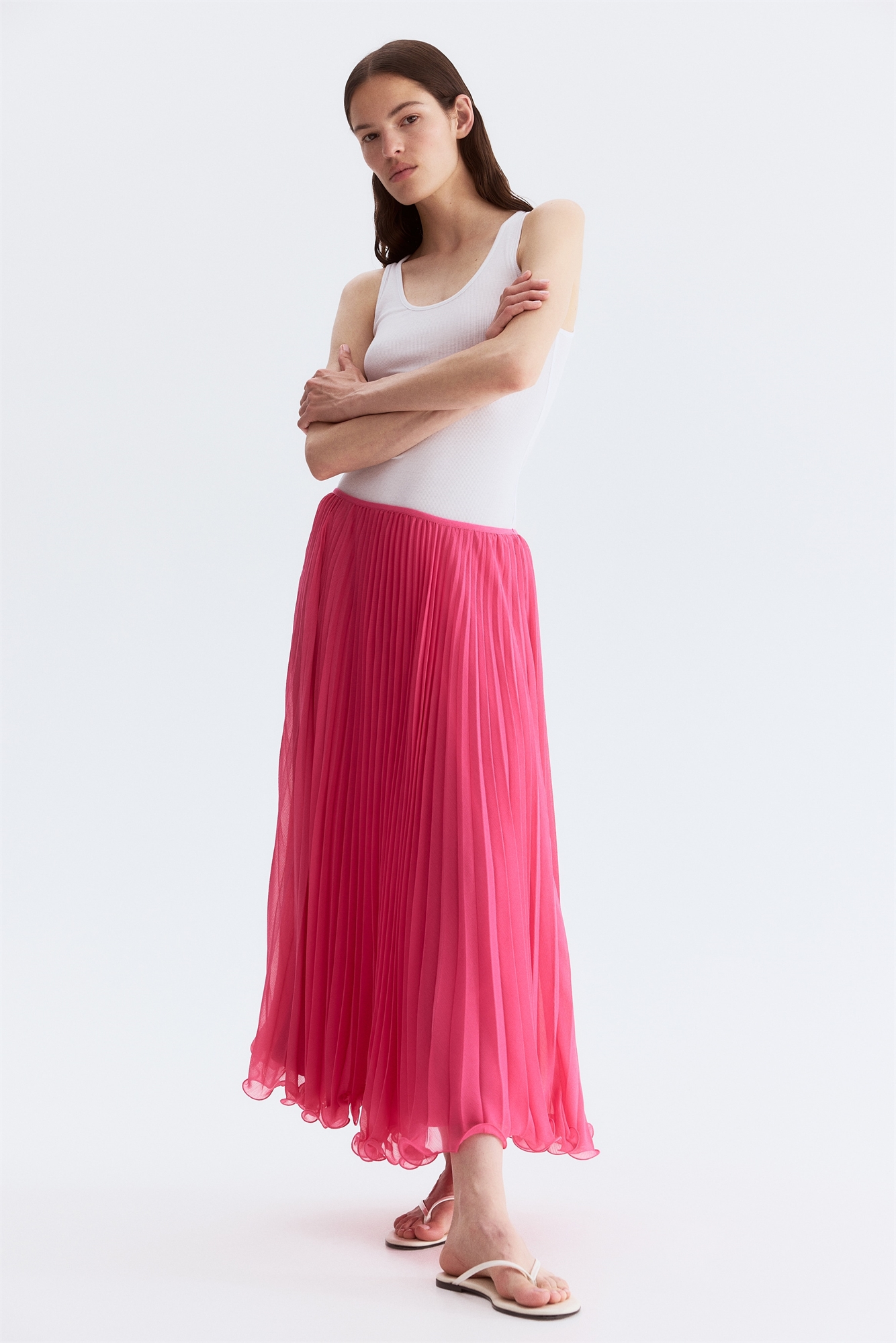 Свободная юбка длиной до щиколоток из плиссированного полотна с высокой талией и узким эластичным поясом. Асимметричный подол с оверлоком. На подкладке.