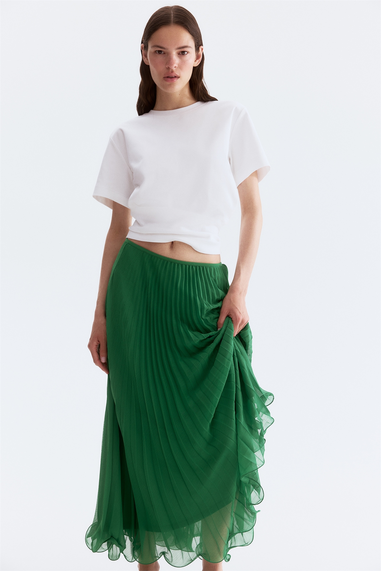 Свободная юбка длиной до щиколоток из плиссированного полотна с высокой талией и узким эластичным поясом. Асимметричный подол с оверлоком. На подкладке.
