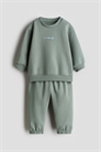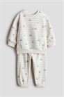Комплект из топа и джоггеров из толстовки с мягкой ворсистой внутренней стороной. Топ с небольшим принтом спереди. Круглый вырез с ребристой отделкой, пуговицы на одном плече (кроме размеров 2-4Y), манжеты и подол в рубчик. Джоггеры с эластичной утягивающейся талией и эластичными вставками на подоле.