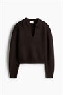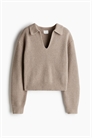 Короткий джемпер из мягкого трикотажа в рубчик с открытым воротником, слегка спущенными плечами и длинными рукавами. Ребристые манжеты и подол.
