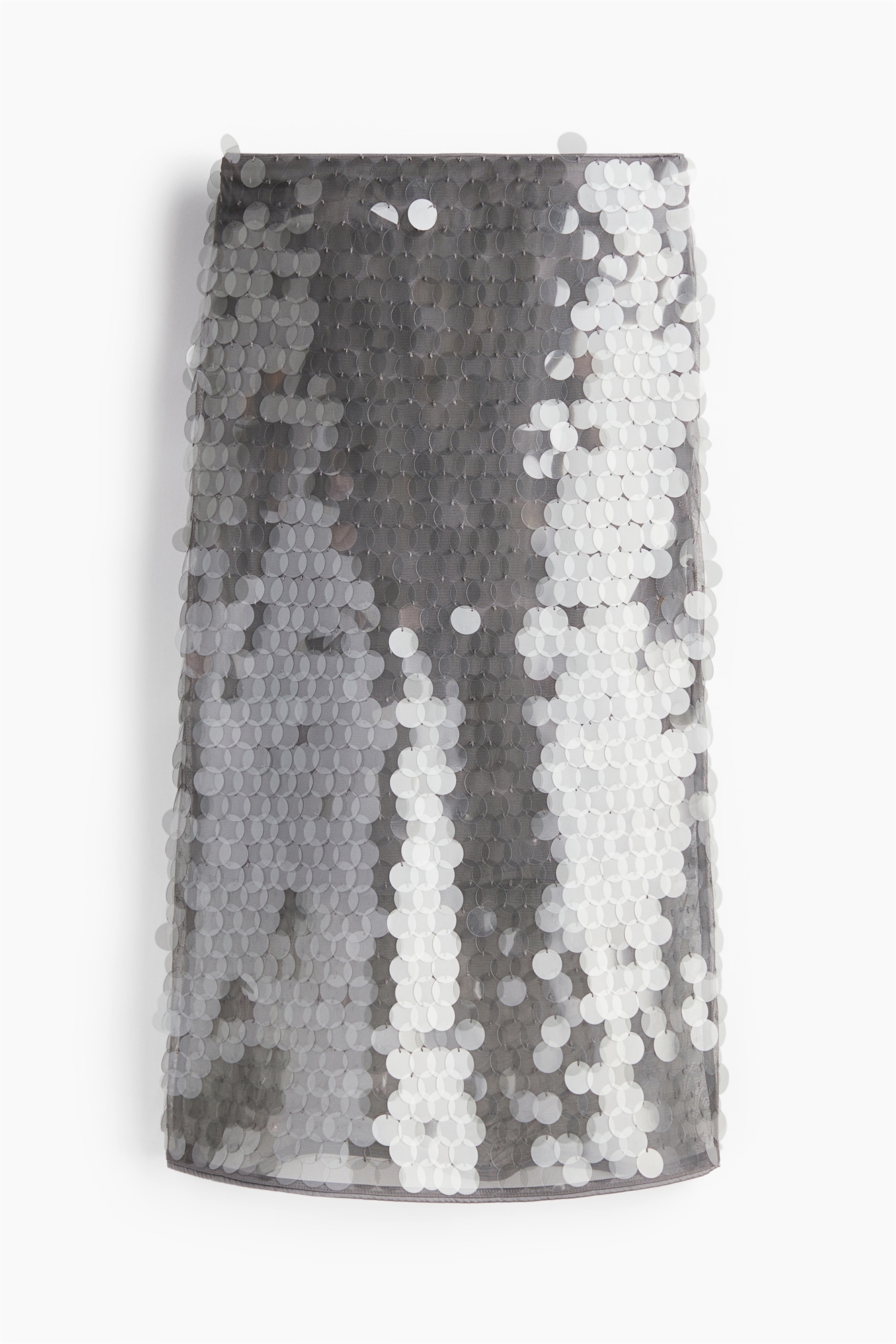Юбка длиной до колена из сетки с блестками, с высокой талией, формирующими вытачками сзади и потайной застежкой на молнию и крючок с глазом с одной стороны. Короткая атласная нижняя юбка.
