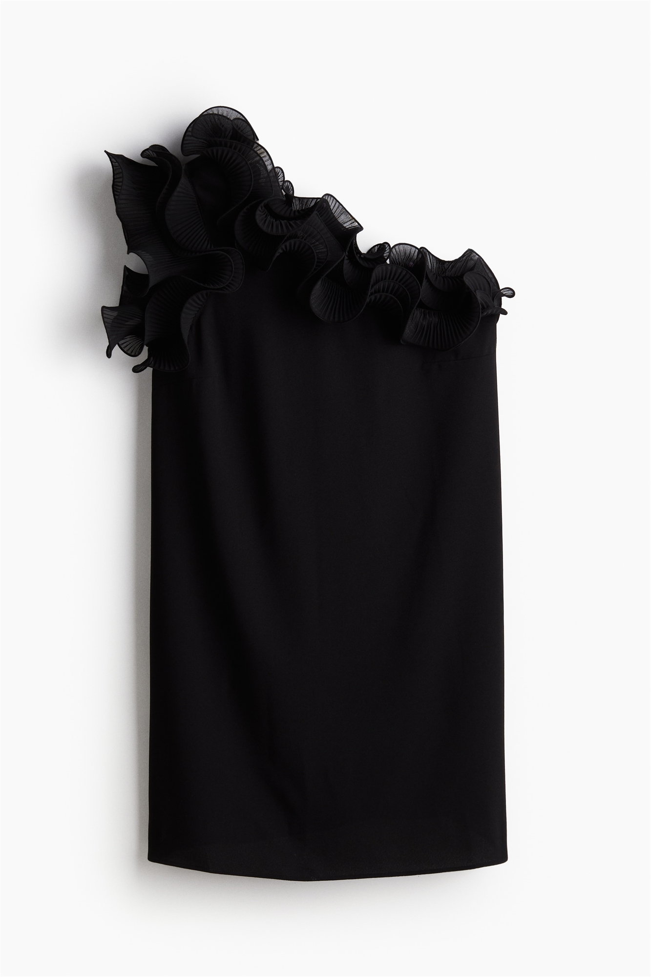 Короткое платье на одно плечо из тканого материала с силуэтом А-линия. Асимметричный вырез, бретелька на одно плечо и декоративная отделка рюшами в верхней части. Без подкладки.