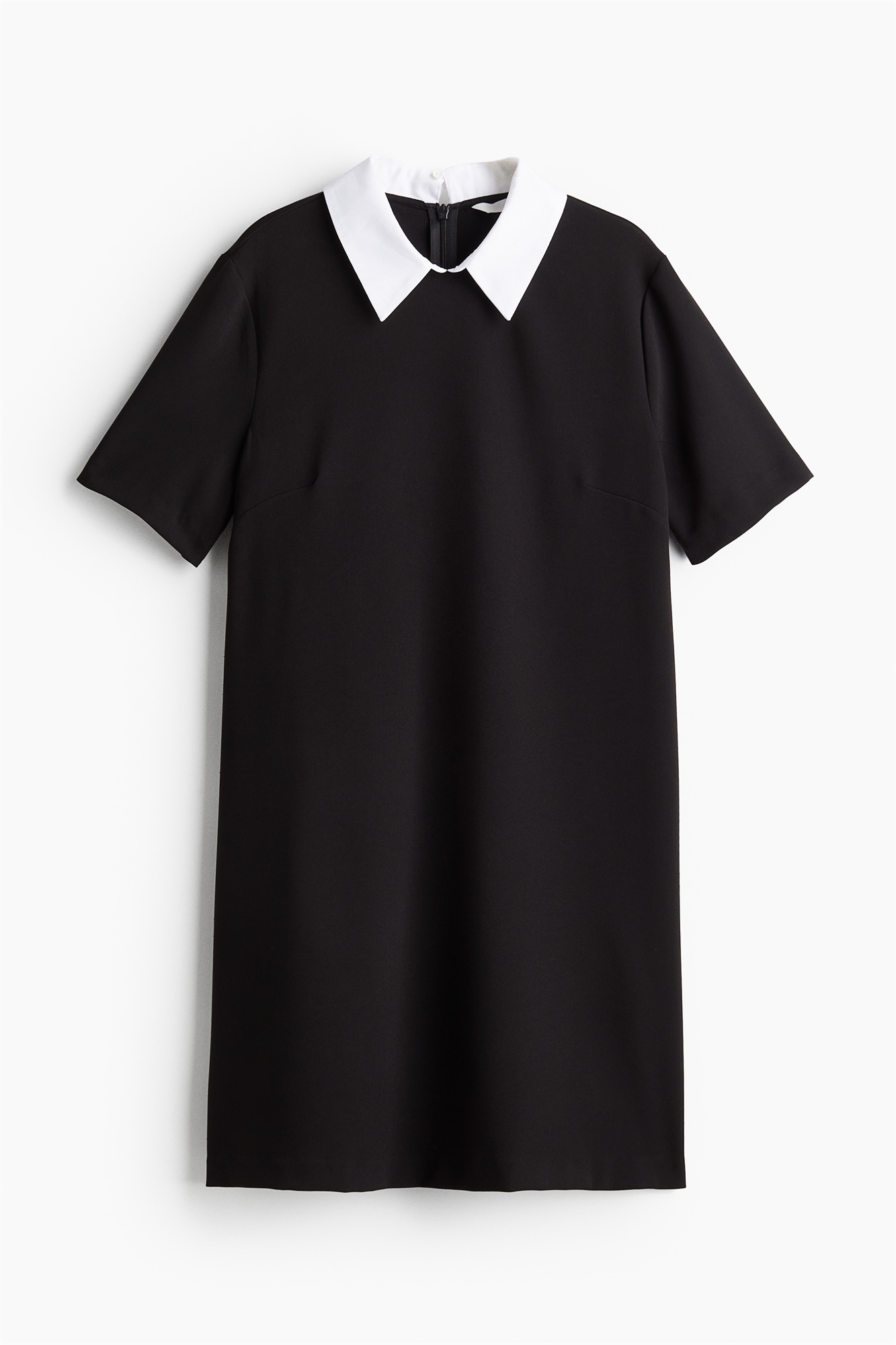 Короткое платье А-линии из тканого материала с воротником из хлопкового поплина. Короткие рукава и потайная застежка на молнию и пуговицу сзади у горловины. Без подкладки.