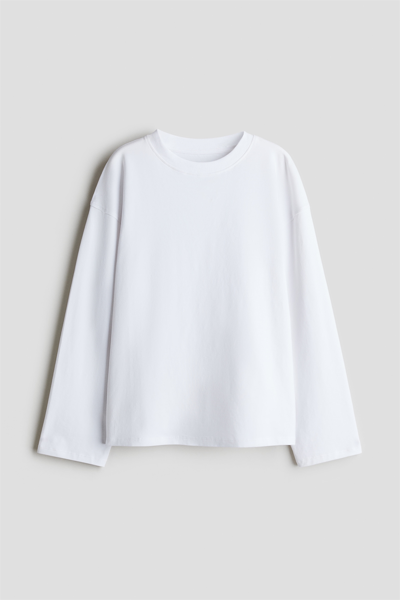 Топ из мягкого хлопкового джерси с круглым вырезом с ребристой отделкой. Свободный крой, спущенные плечи и длинные рукава.