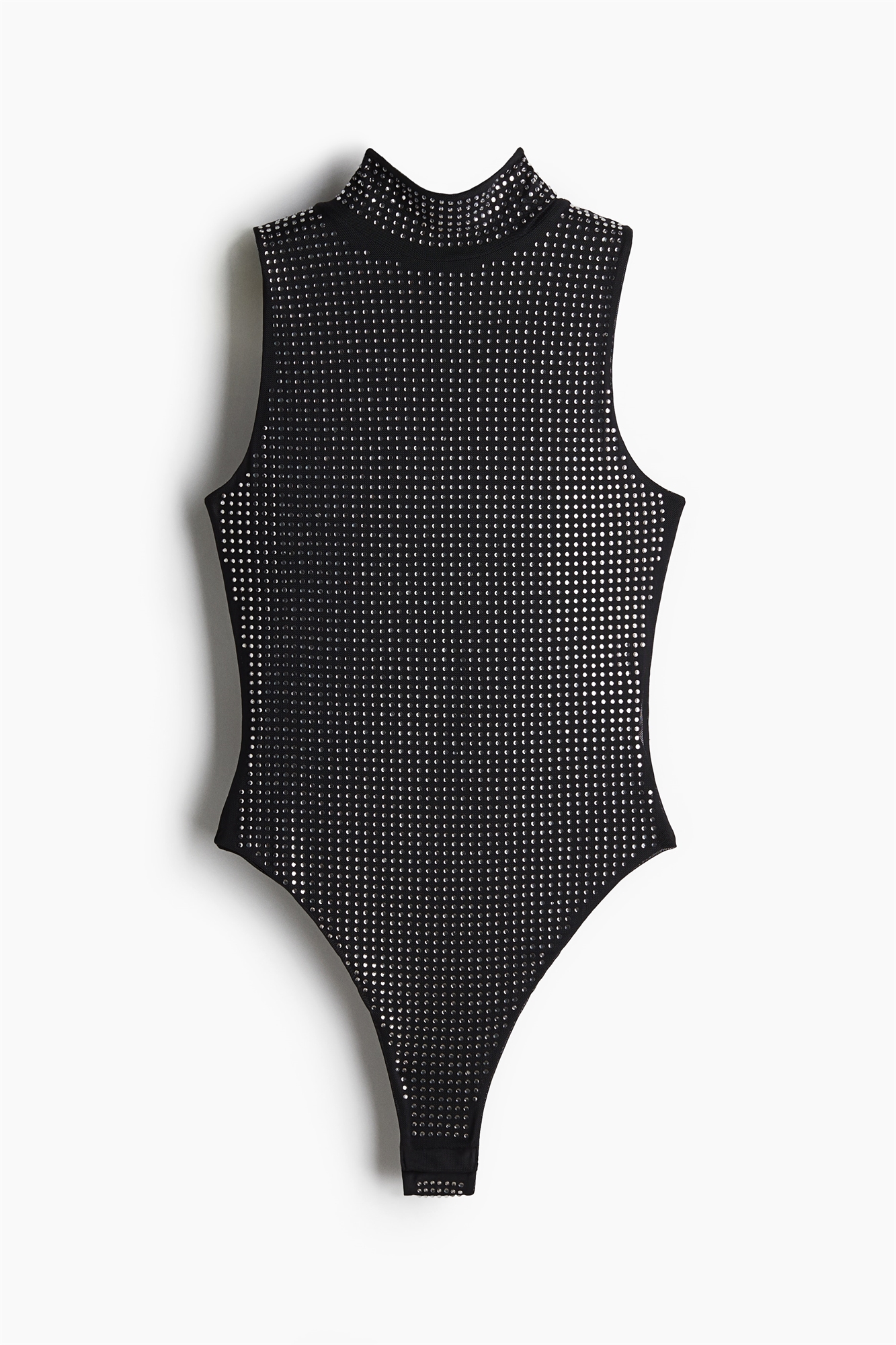 Боди без рукавов из сетки, украшенное по всей поверхности сверкающими стразами. Черепаховая горловина и потайные кнопки в промежности. Подкладка из джерси.