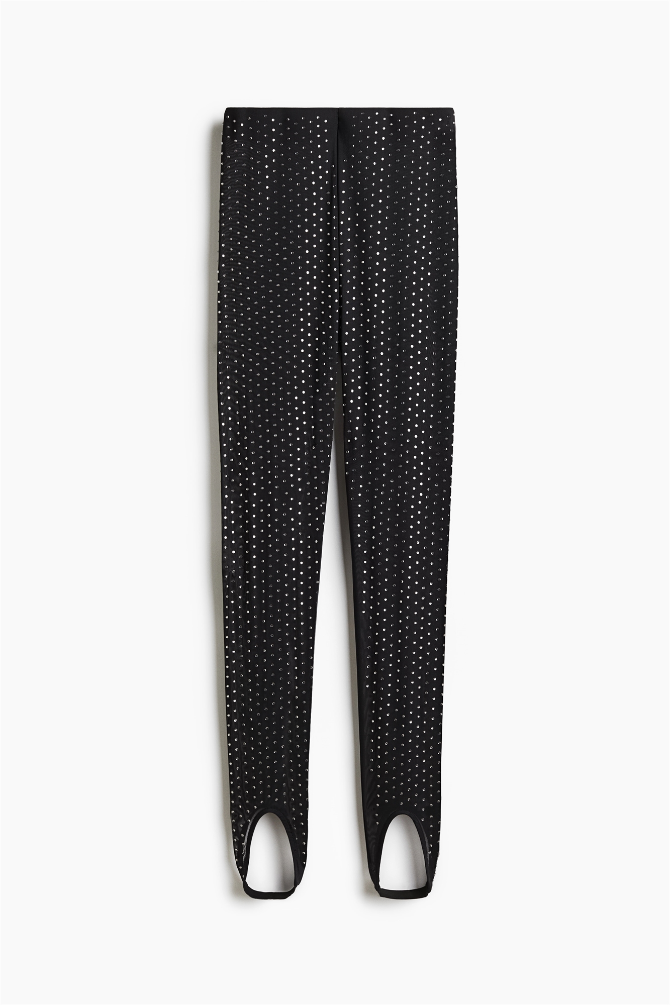 Леггинсы со штрипками из сетки, украшенные по всему периметру сверкающими стразами. Высокая талия со скрытой резинкой.