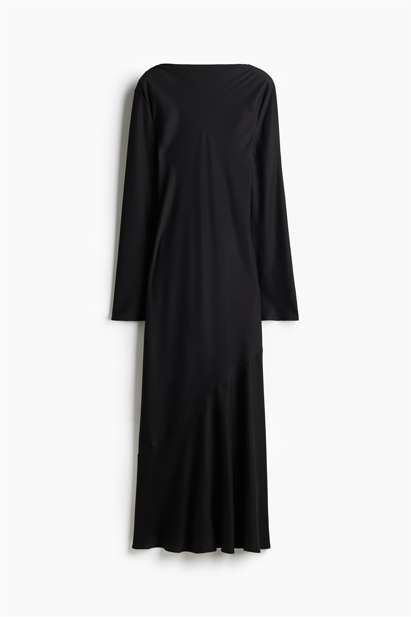 Платье длиной до щиколоток из мягко драпирующегося атласа с высоким вырезом и элегантной открытой спиной с горизонтальными завязками-спагетти. Длинные рукава и диагональный шов на юбке для придания подолу дополнительного объема. Без подкладки.