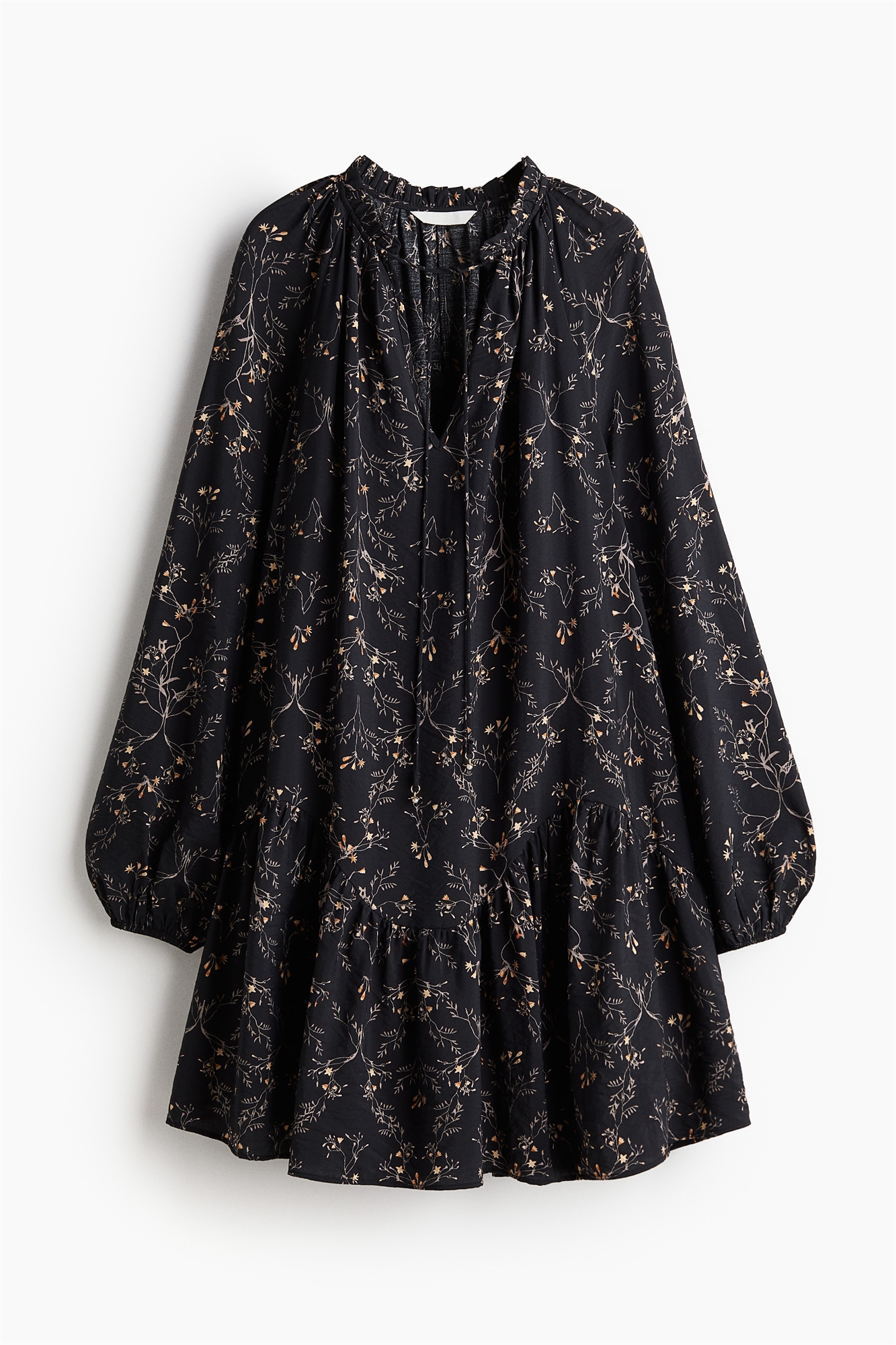 Короткое платье из мягкого тканого материала с V-образным вырезом и свободным кроем. Воротник с небольшим воланом и узким шнурком, украшенным на концах бусинами в форме цветка. Длинные рукава-баллон покроя реглан с узкой резинкой на конце и широким воланом по подолу для придания объема. Без подкладки.
