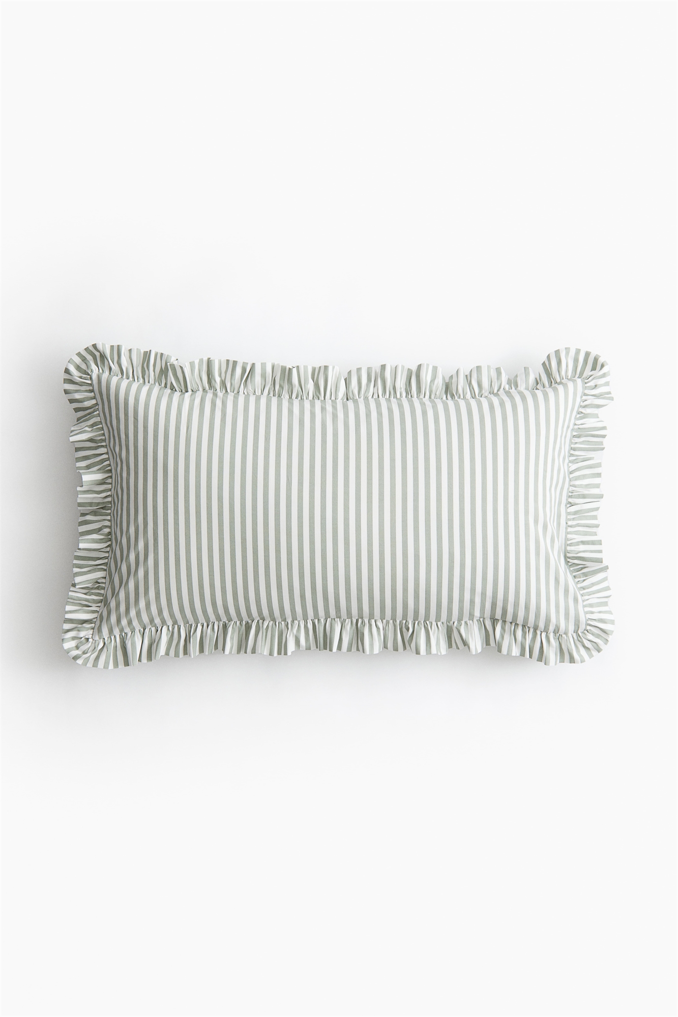 Наволочка из хлопкового полотна с оборкой по краям и отверстием-конвертом сзади.