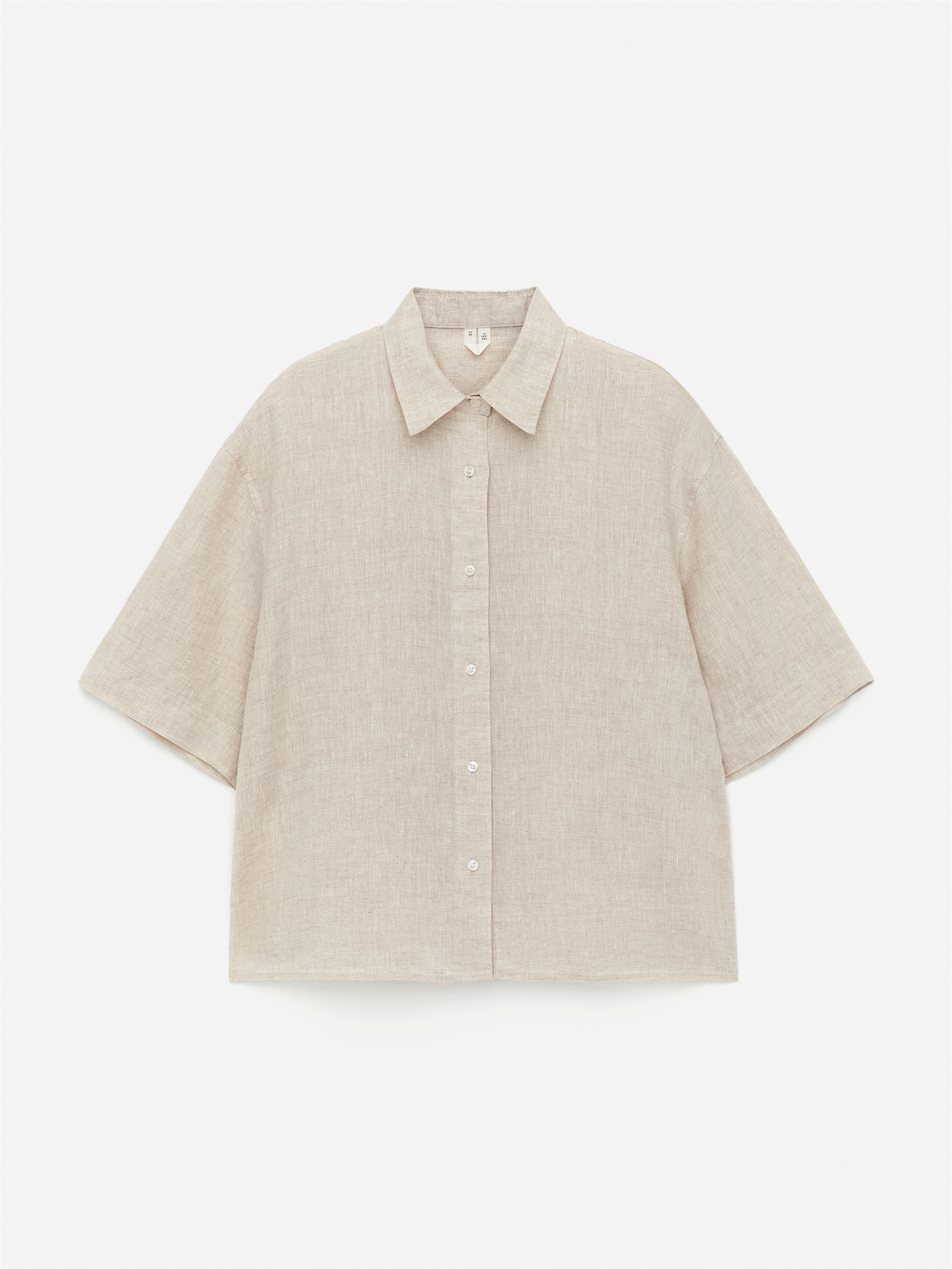 Льняная рубашка с короткими рукавами, застежкой на пуговицы и одним нагрудным карманом. Свободный крой.