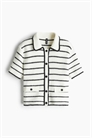 Короткий кардиган из мягкого трикотажа с закругленным ребристым воротником, пуговицами спереди и короткими рукавами. Ребристые декоративные клапаны карманов с пуговицей спереди. Ребрышки на пуговицах, манжетах и подоле.