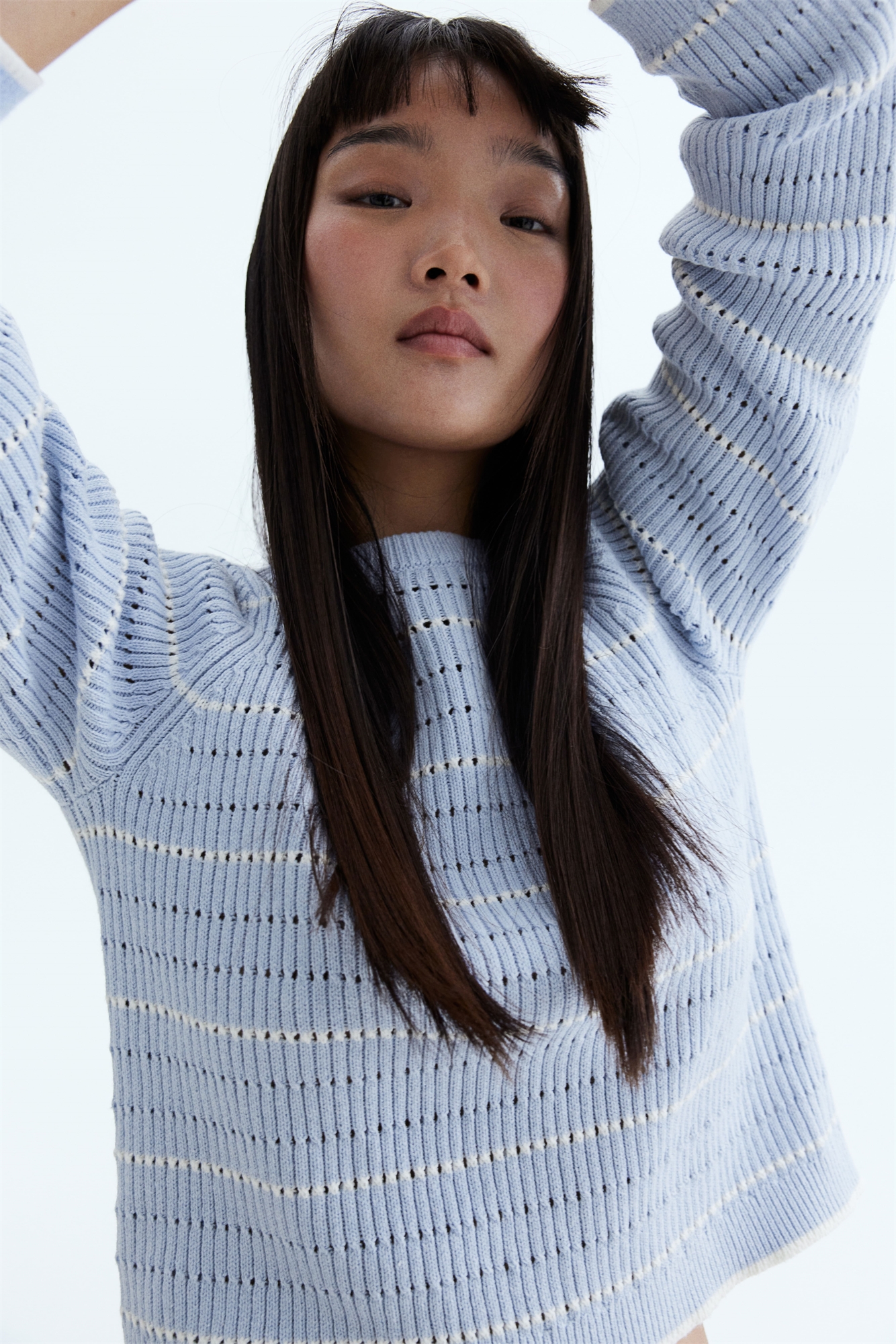 Джемпер из мягкого трикотажа в рубчик с перфорацией. Круглый вырез в рубчик, длинные рукава, манжеты и подол в рубчик.