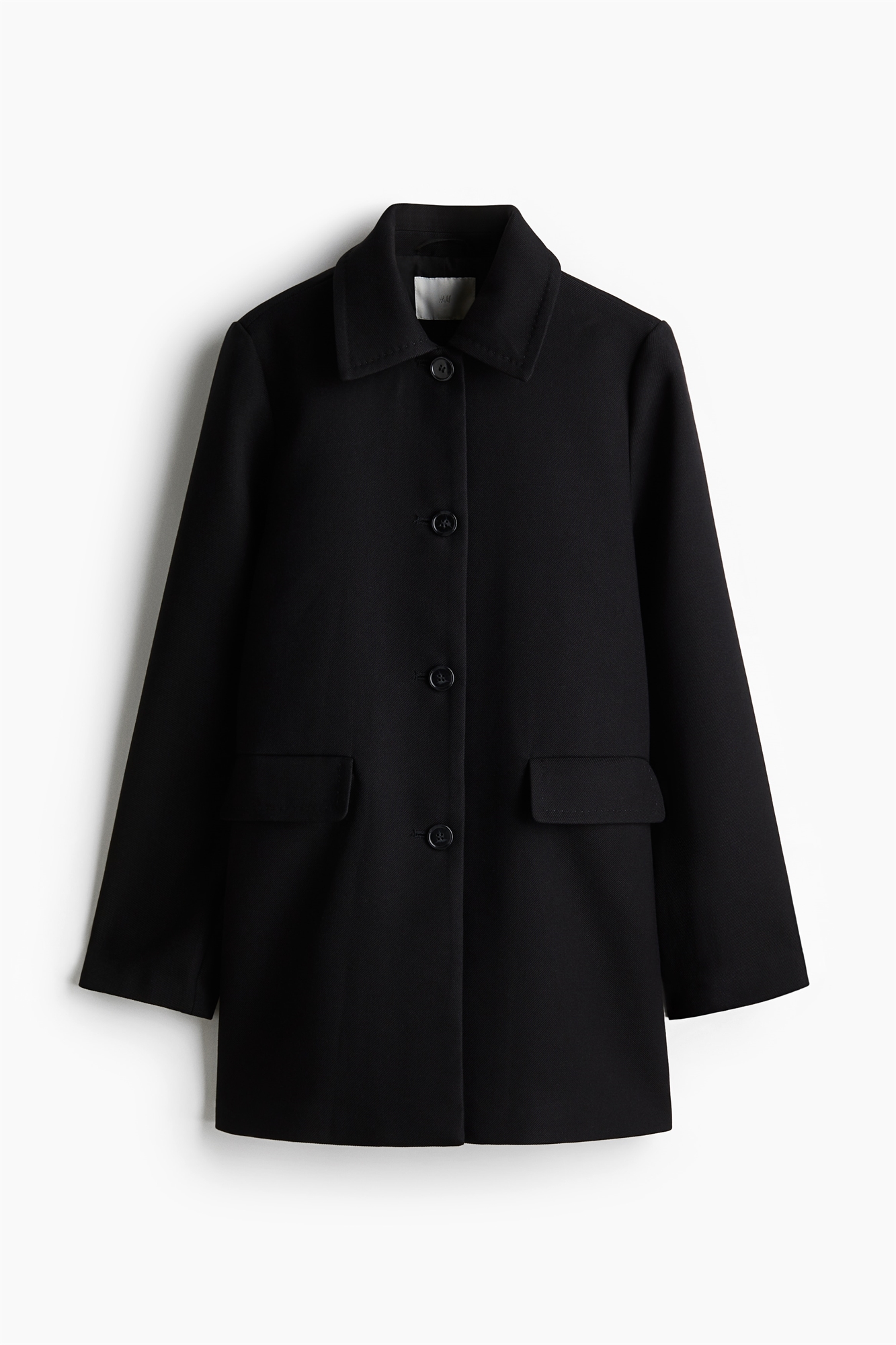 Короткое пальто А-линии из тканого материала с воротником, пуговицами спереди и накладными карманами спереди. На подкладке.