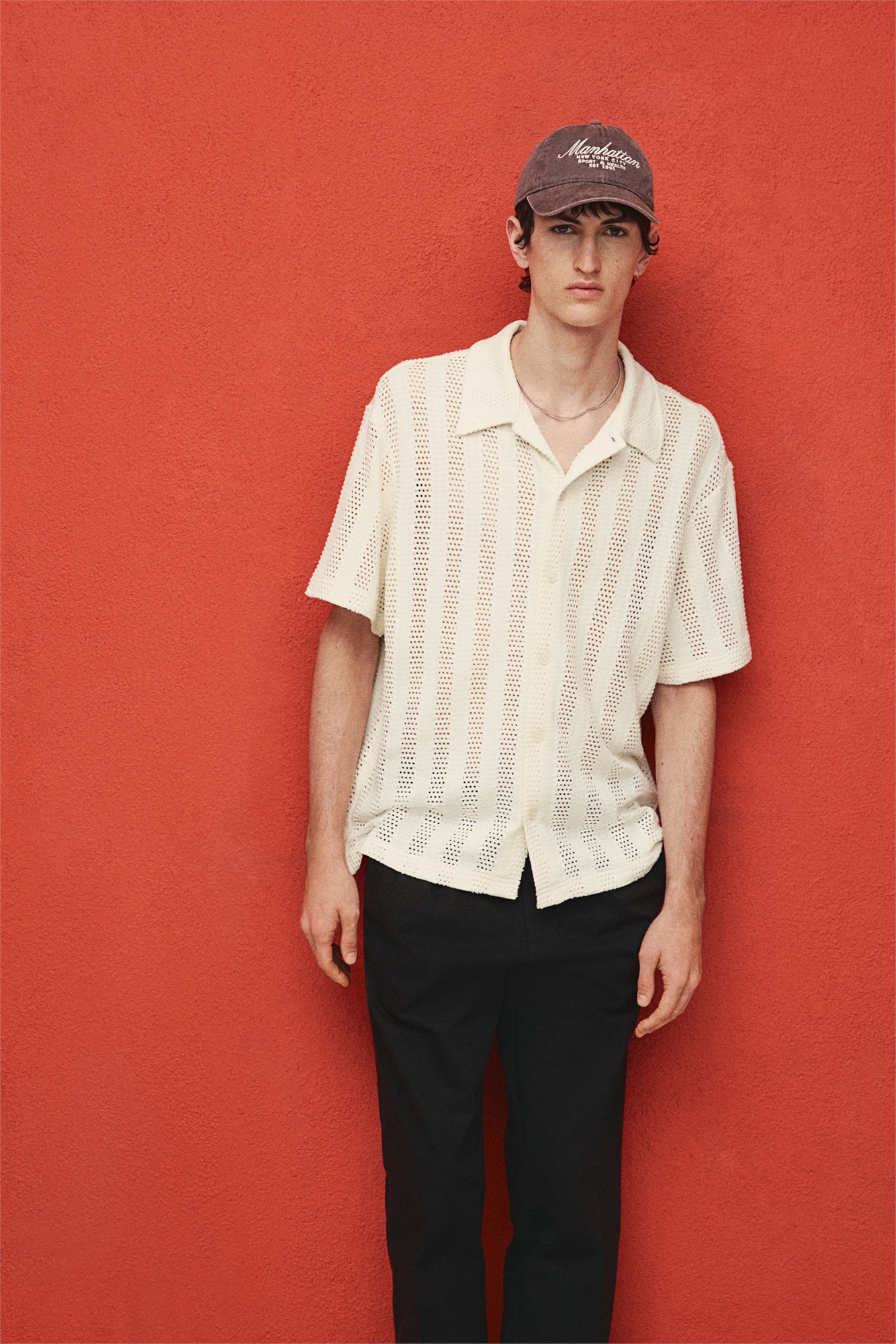 Рубашка с короткими рукавами из жаккардового трикотажа с отложным воротником, классическим передом и прямым подолом. Регулярный крой для комфортной носки и классического силуэта.