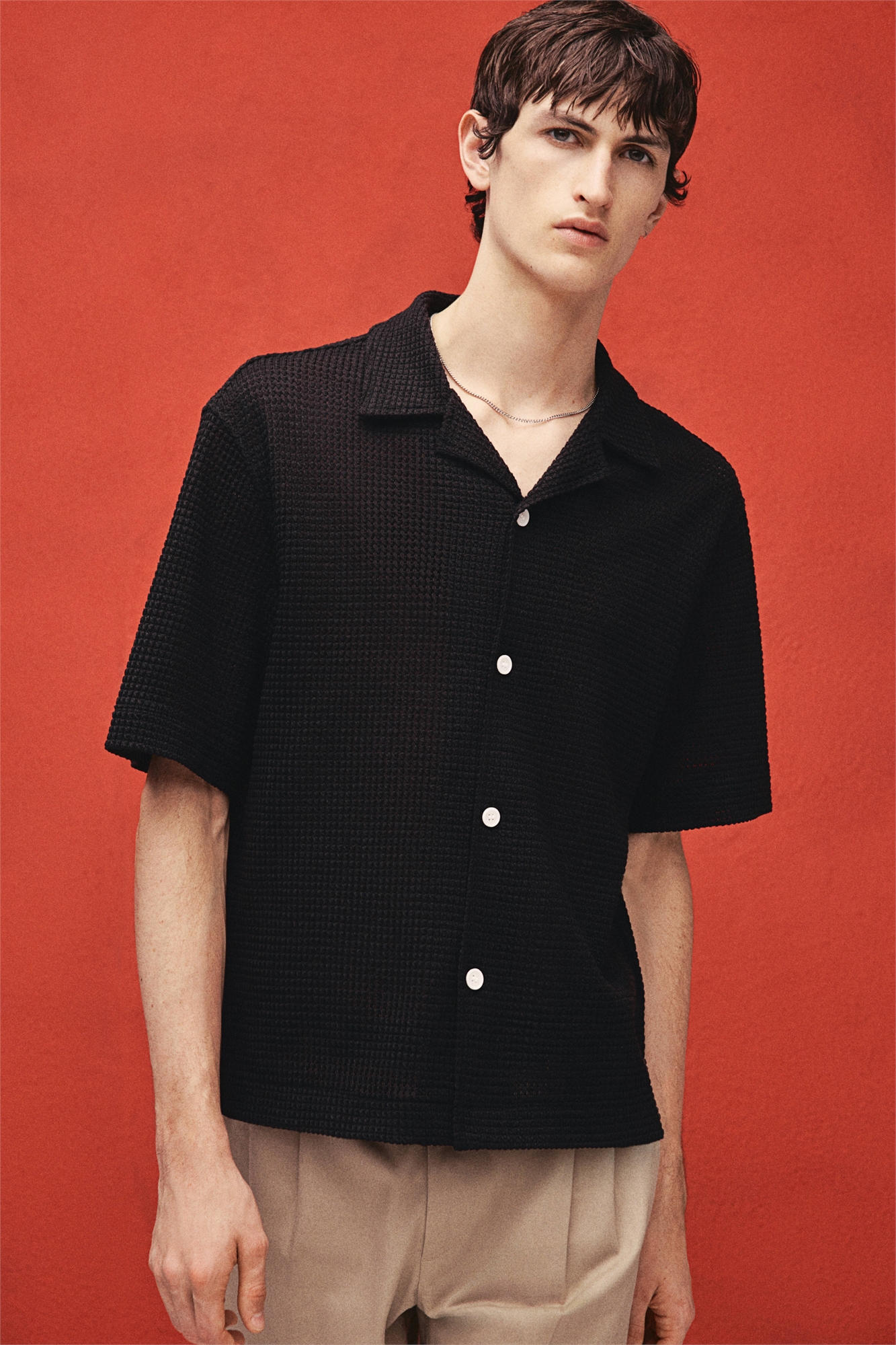 Рубашка с короткими рукавами из жаккардового трикотажа с отложным воротником, классическим передом и прямым подолом. Регулярный крой для комфортной носки и классического силуэта.